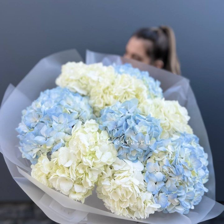 9 бело-голубых гортензий