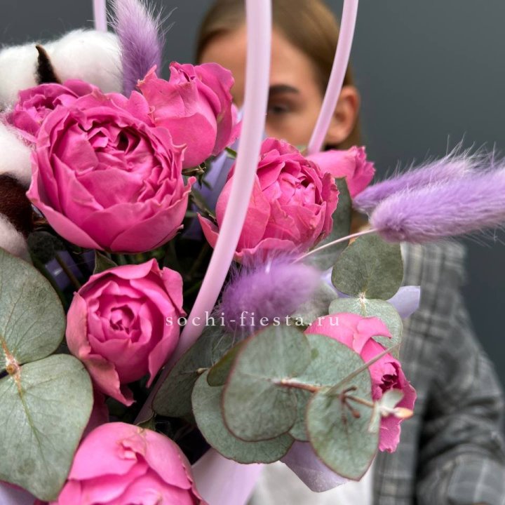 Пионовидные розы в джутовом кашпо