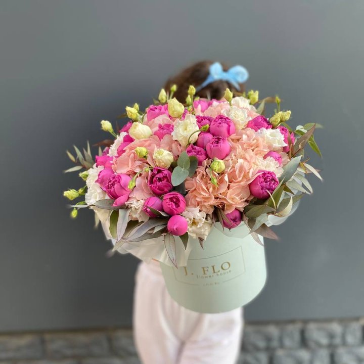 Цветочная корзина из пионов и пионовидных роз "Юниверсити"