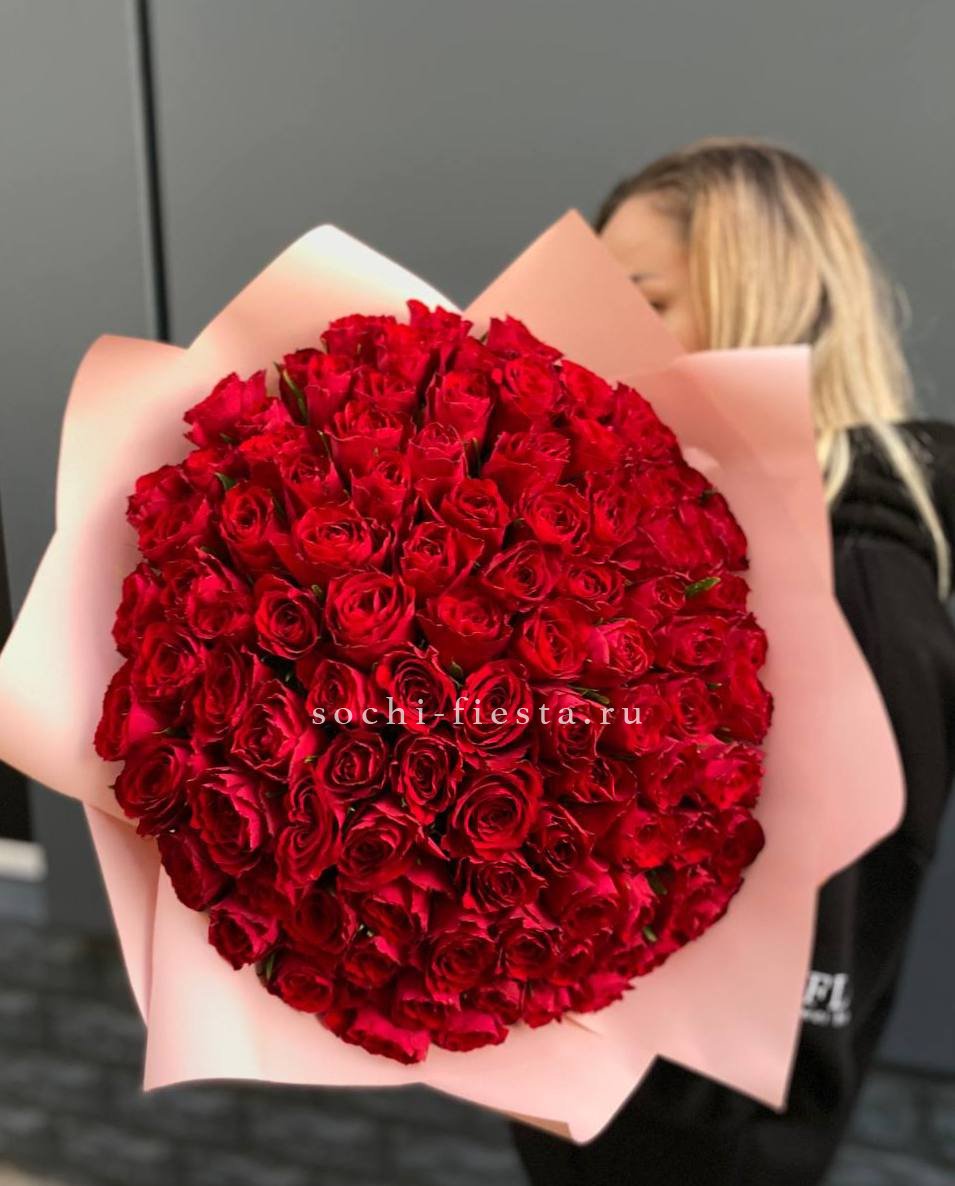 Сто одна роза Madam Red образует объёмное цветовое пятно с глубоким красным оттенком. Букет занимает пространство и сразу притягивает внимание своей насыщенностью.