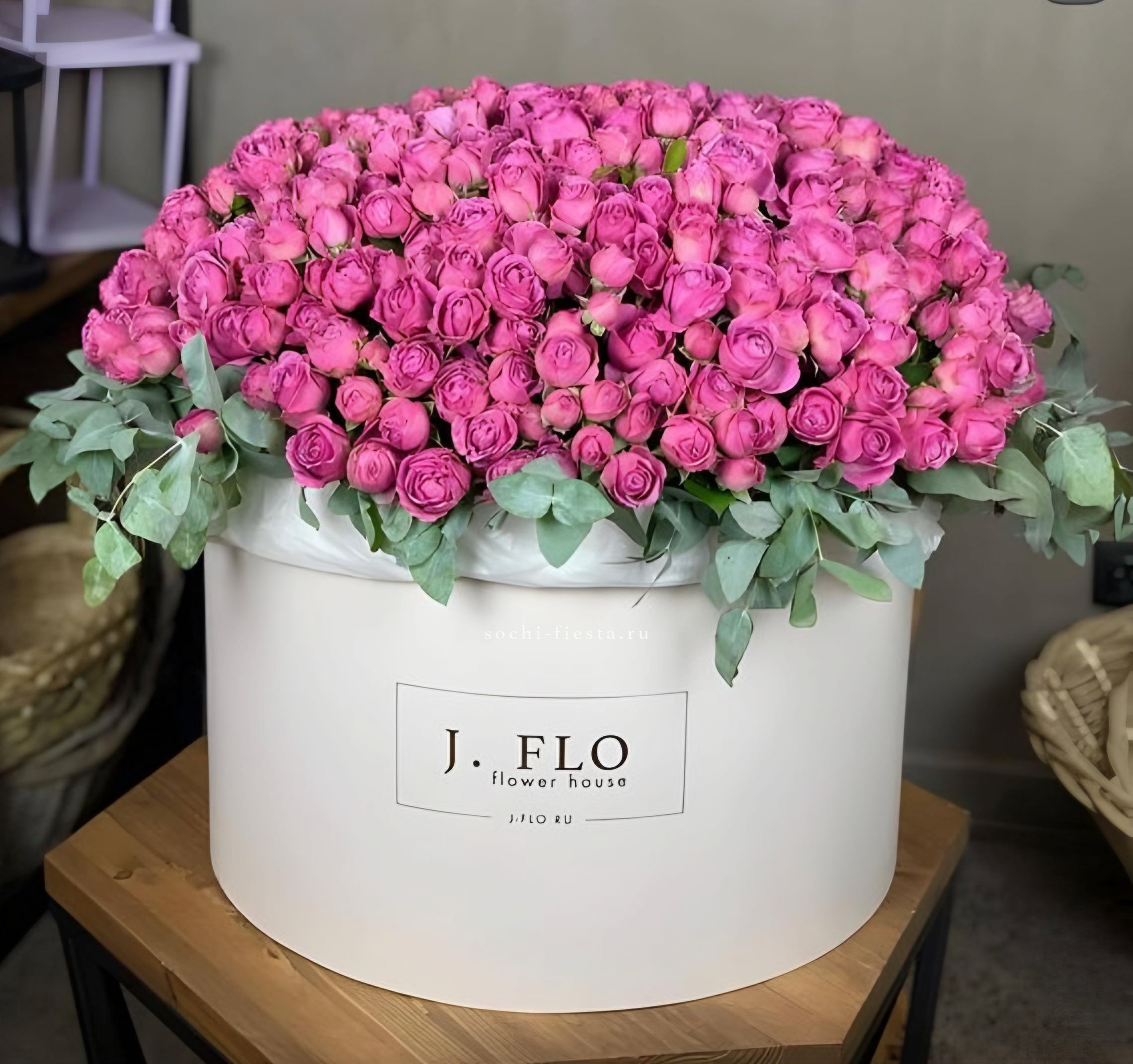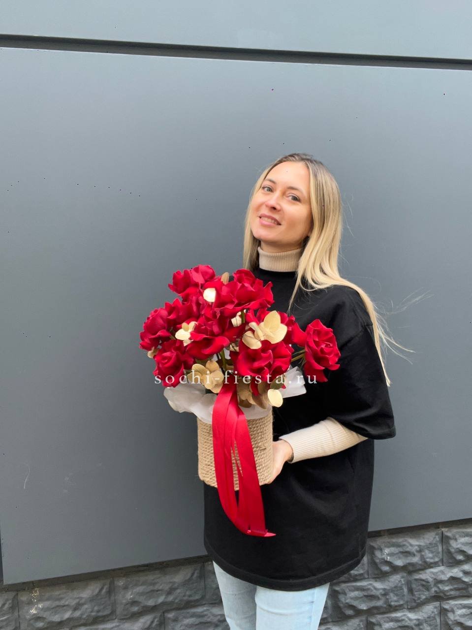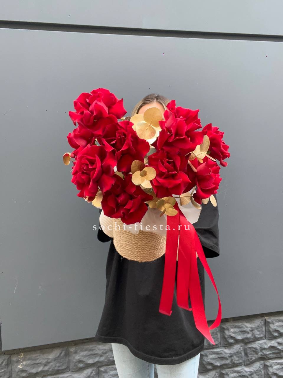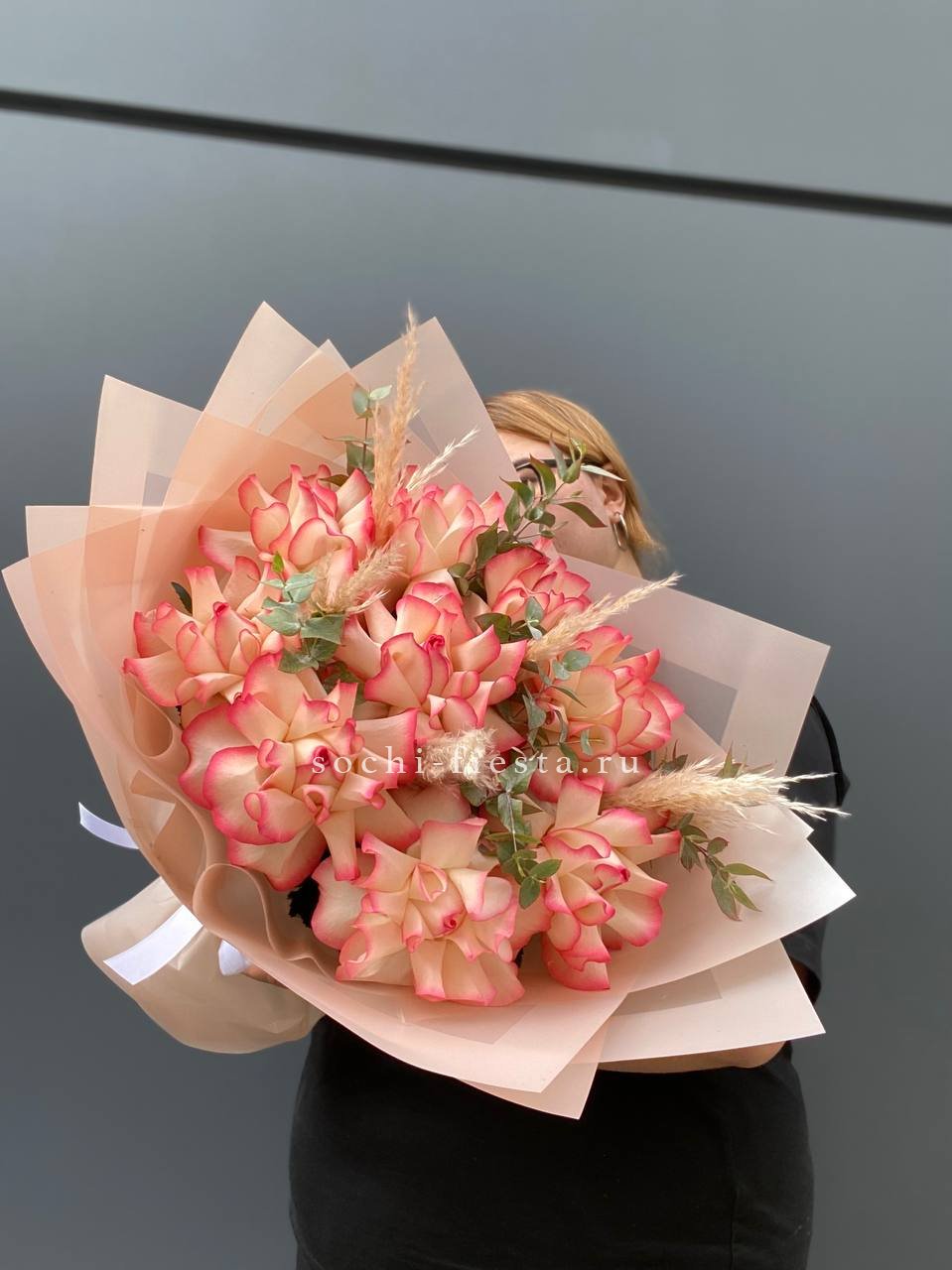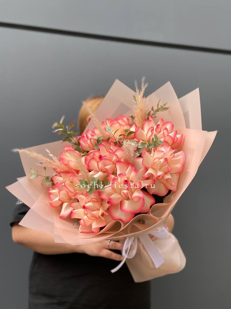 Пятнадцать вывернутых роз Джумилия раскрывают свою многослойную структуру в каждом бутоне. Эвкалипт обрамляет композицию, подчёркивая фактуру лепестков.