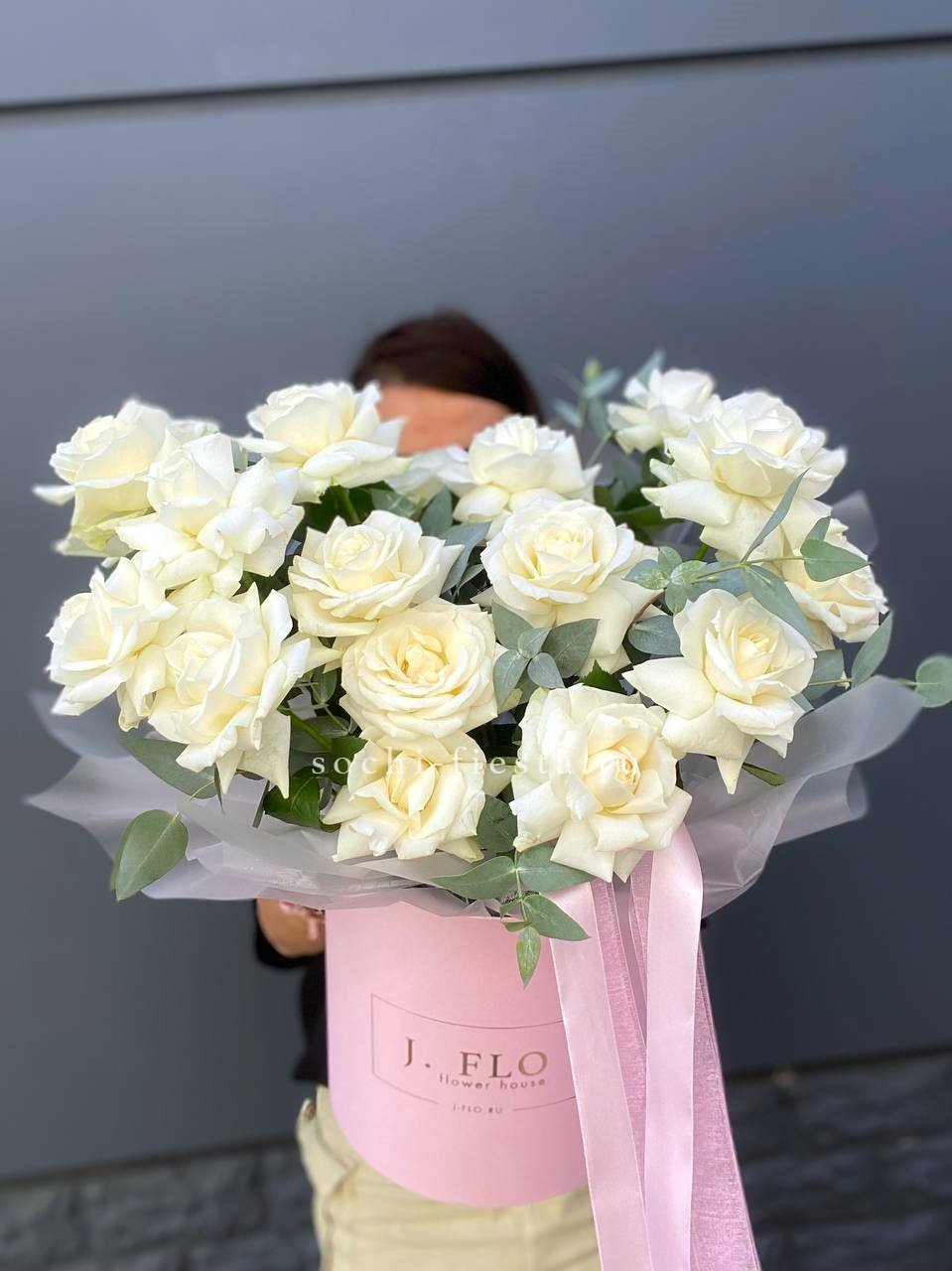 Тридцать девять роз в цилиндре выстраиваются в чёткую геометрию красного и белого. Плотная сборка на оазисе держит форму и создаёт графичное цветовое решение.