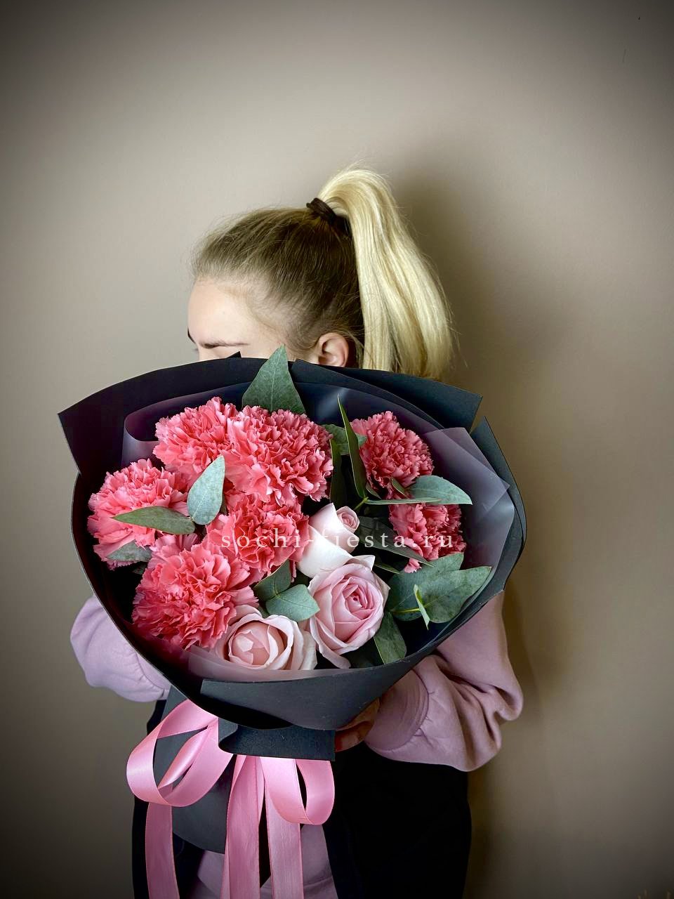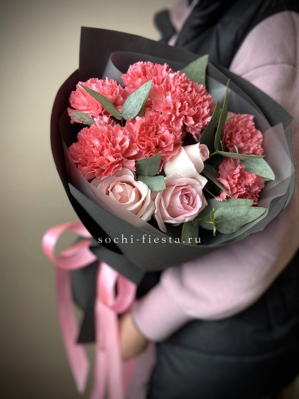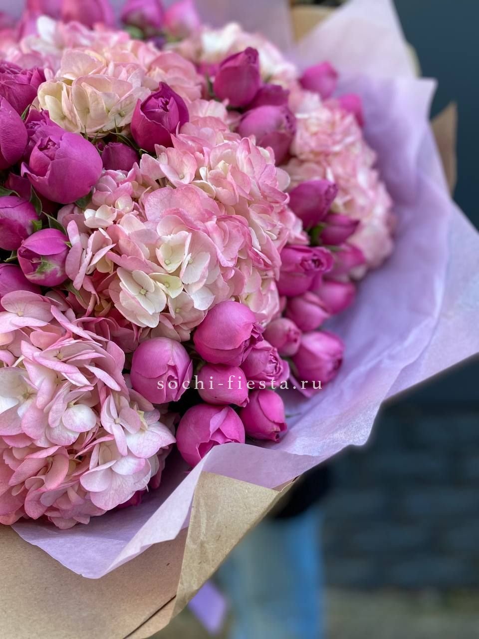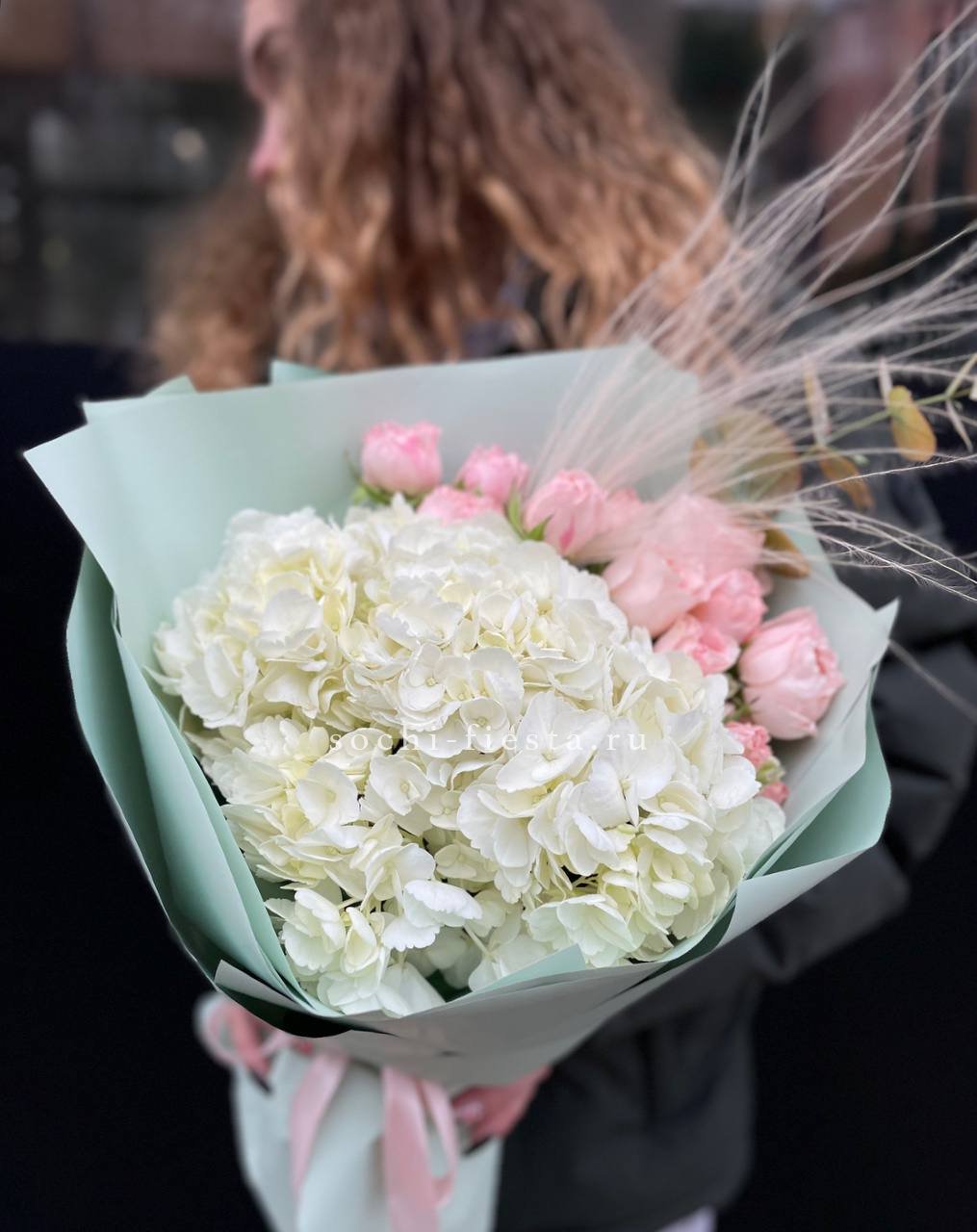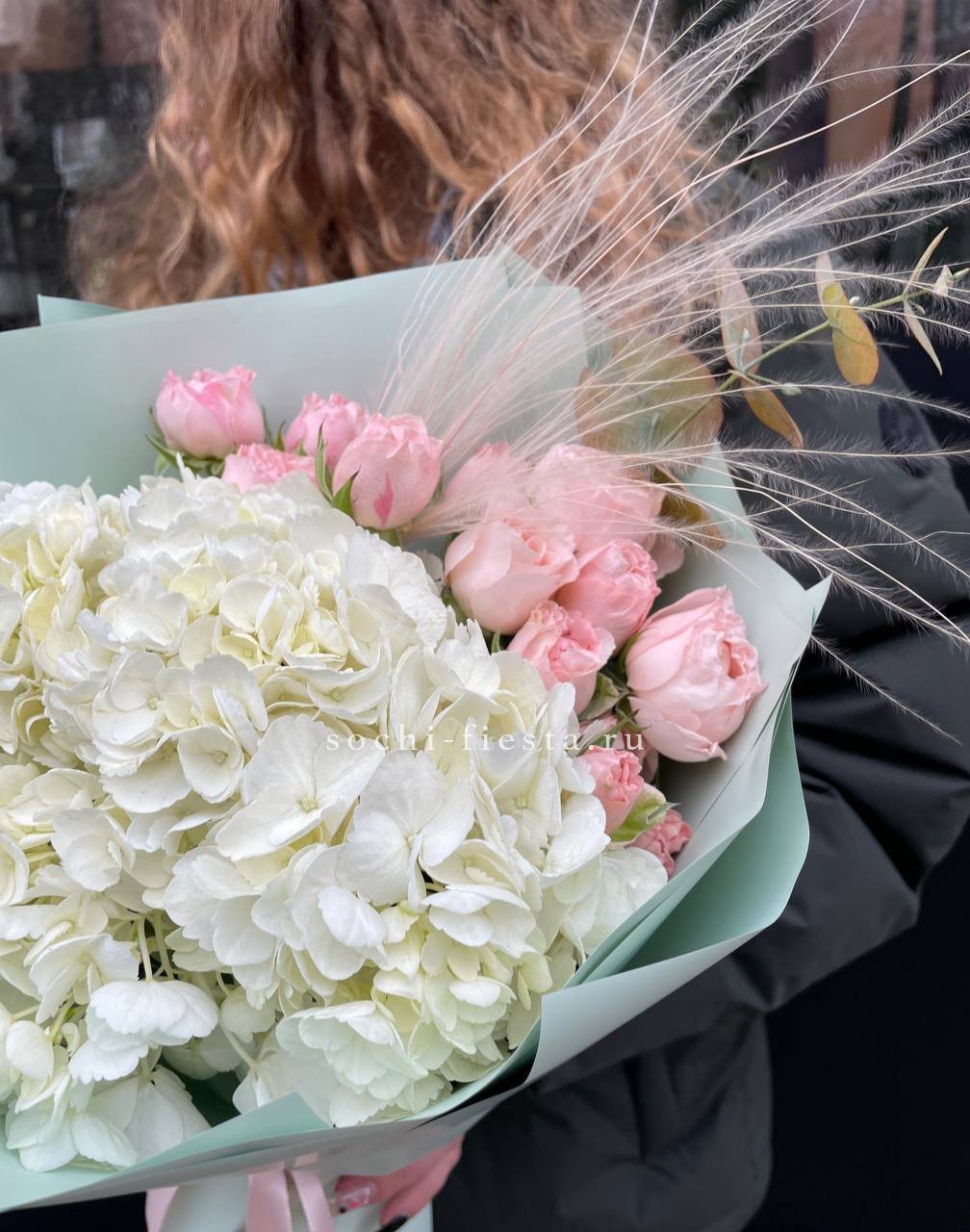 гортензия, розовые розы, пионовидные розы, диантус, эвкалипт, лента, сумка-кашпо.