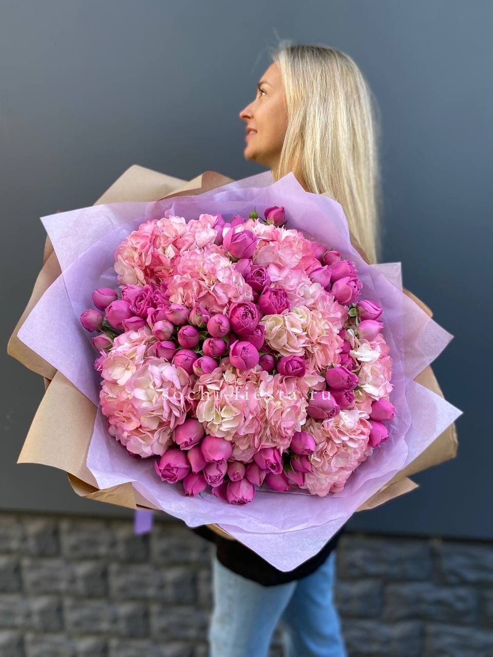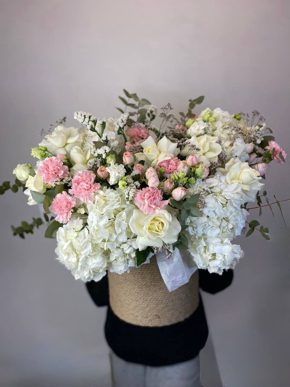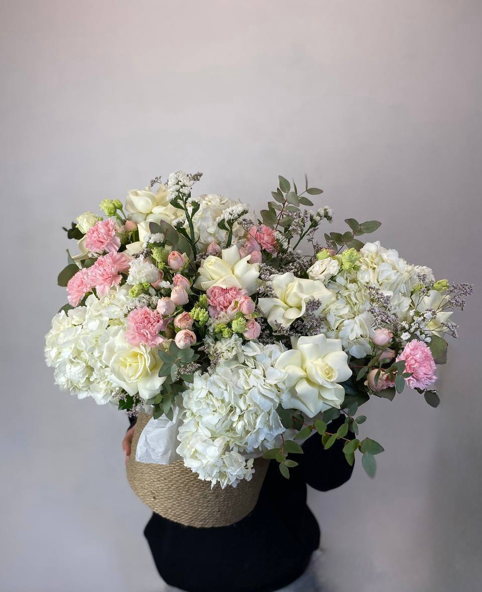 Гортензия и пионовидные розы создают густую округлую форму с мягкими переходами оттенков. Диантус добавляет воздушные вкрапления между крупными бутонами. Композиция в сумке-кашпо держит силуэт и выглядит цельно.
