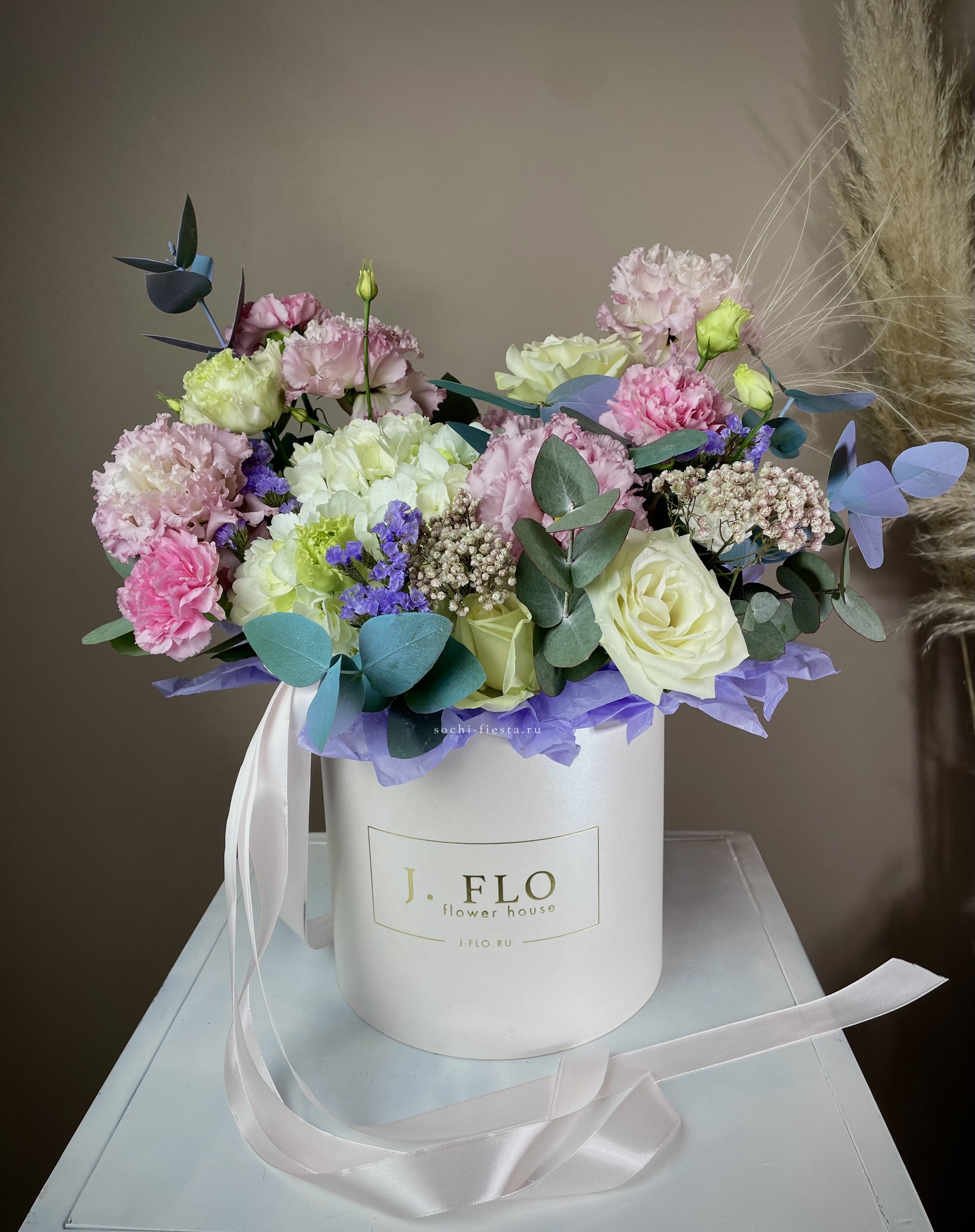 Белые розы встречаются с лиловым диантусом и кремовой эустомой в круглом боксе. Озотамнус и эвкалипт создают фактурный фон для цветочной композиции.
