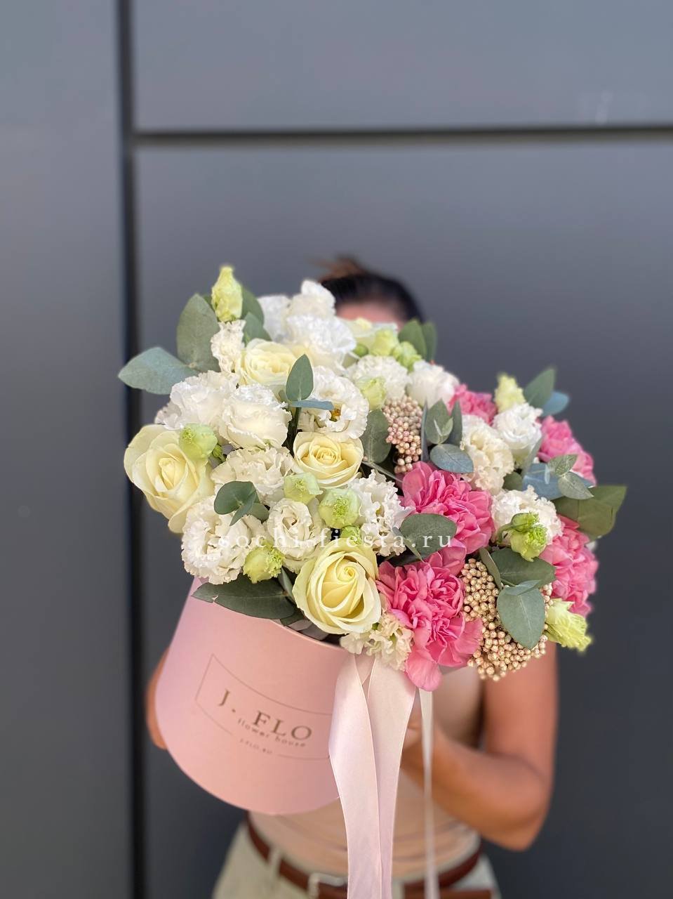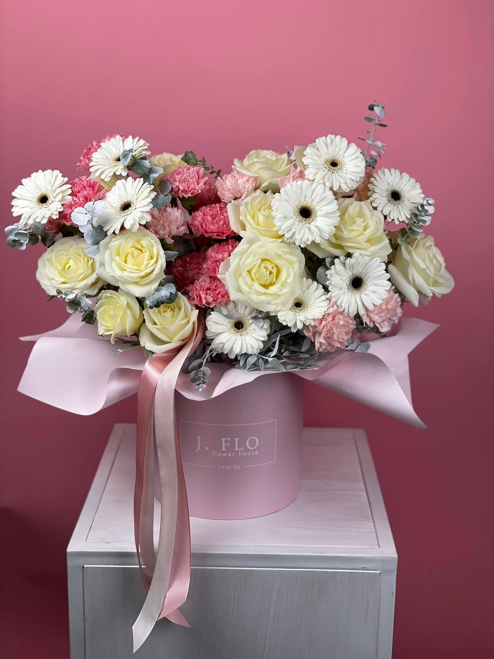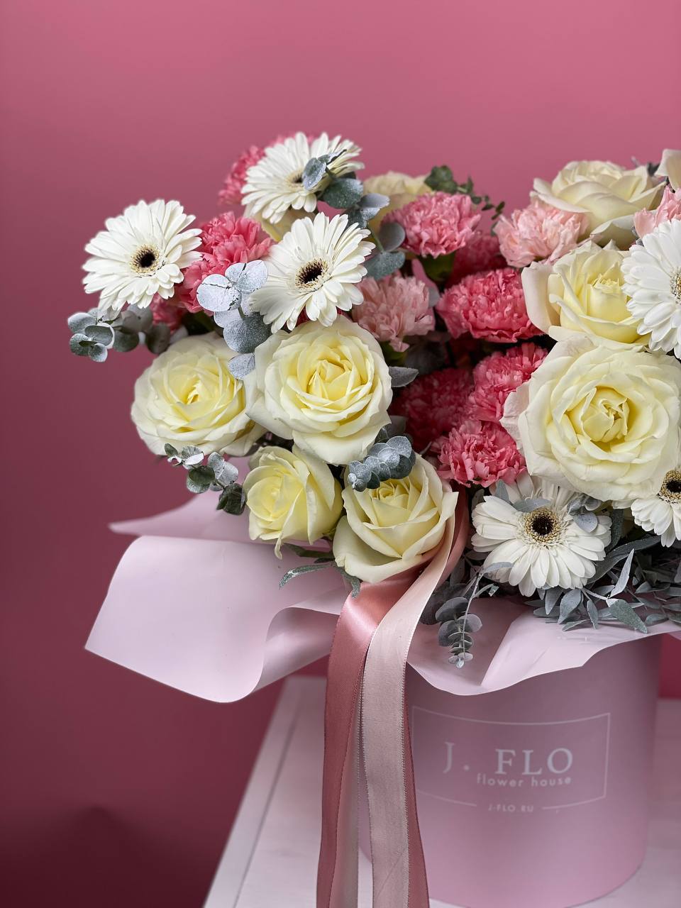 белая роза, диантус, эустома, озатамус, эвкалипт, бокс D20.