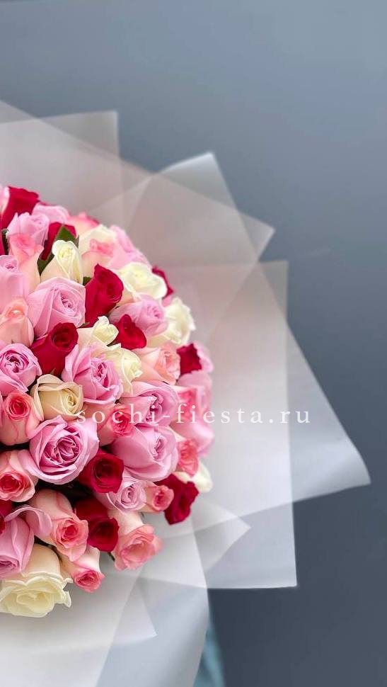 Пятьдесят пять бутонов создают объемную композицию с выразительным силуэтом. Розовый цвет наполняет пространство светом. Авторское оформление завершает образ.