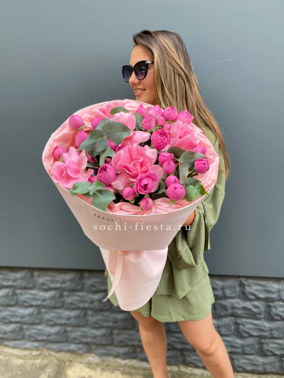 пионовидные розы, розовые розы, эвкалипт, лента, дизайнерская упаковка.