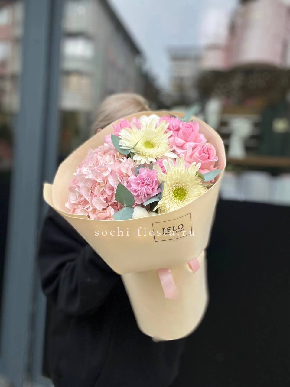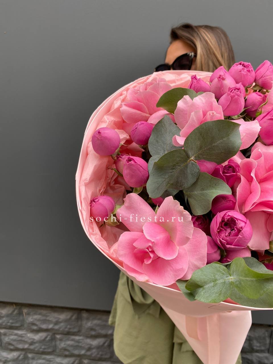 Розовая гамма раскрывается через махровые пионовидные бутоны и классические розы с плотной текстурой лепестков. Эвкалипт вплетается в композицию, создавая свежий акцент.