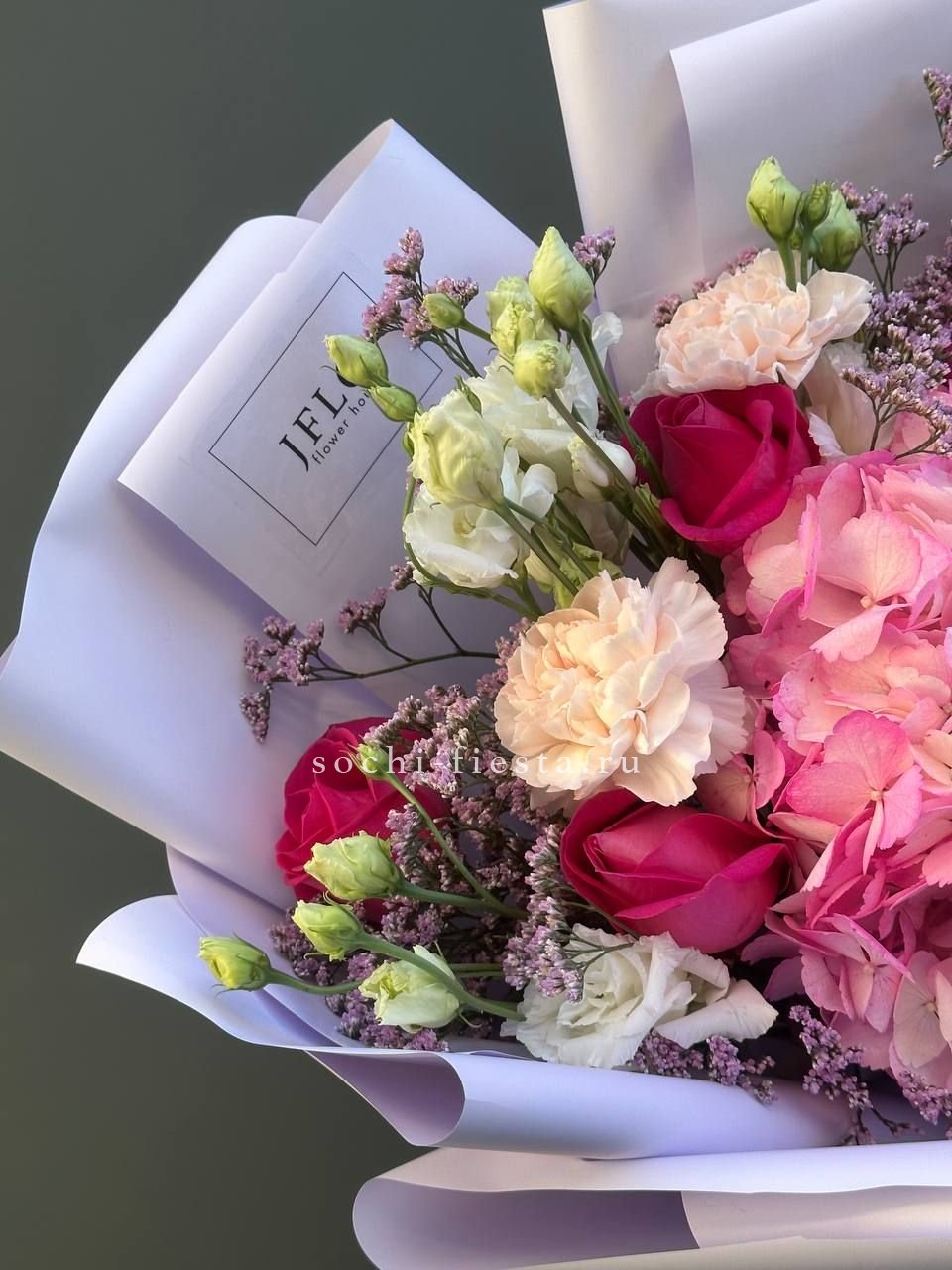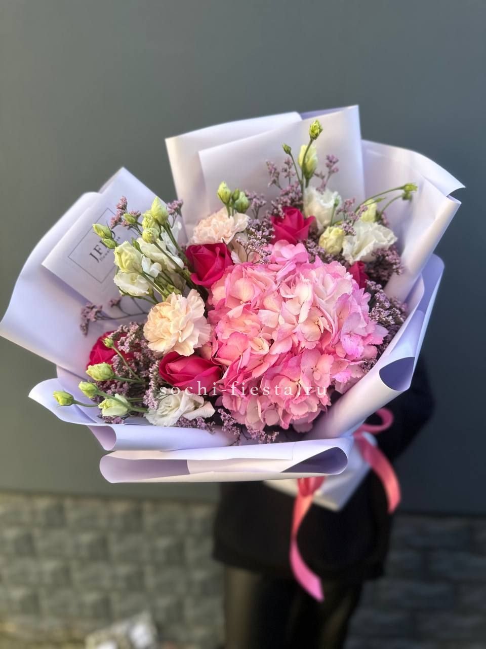 Розовая гортензия и эустома раскрывают свою красоту в каждом лепестке. Мягкие оттенки переходят один в другой, создавая спокойное и гармоничное впечатление.