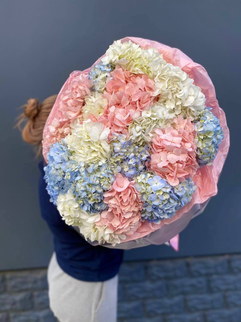 Девятнадцать соцветий гортензии собраны в объемную композицию с естественной воздушностью. Каждая головка раскрывается множеством мелких лепестков, создавая плотное цветовое облако.