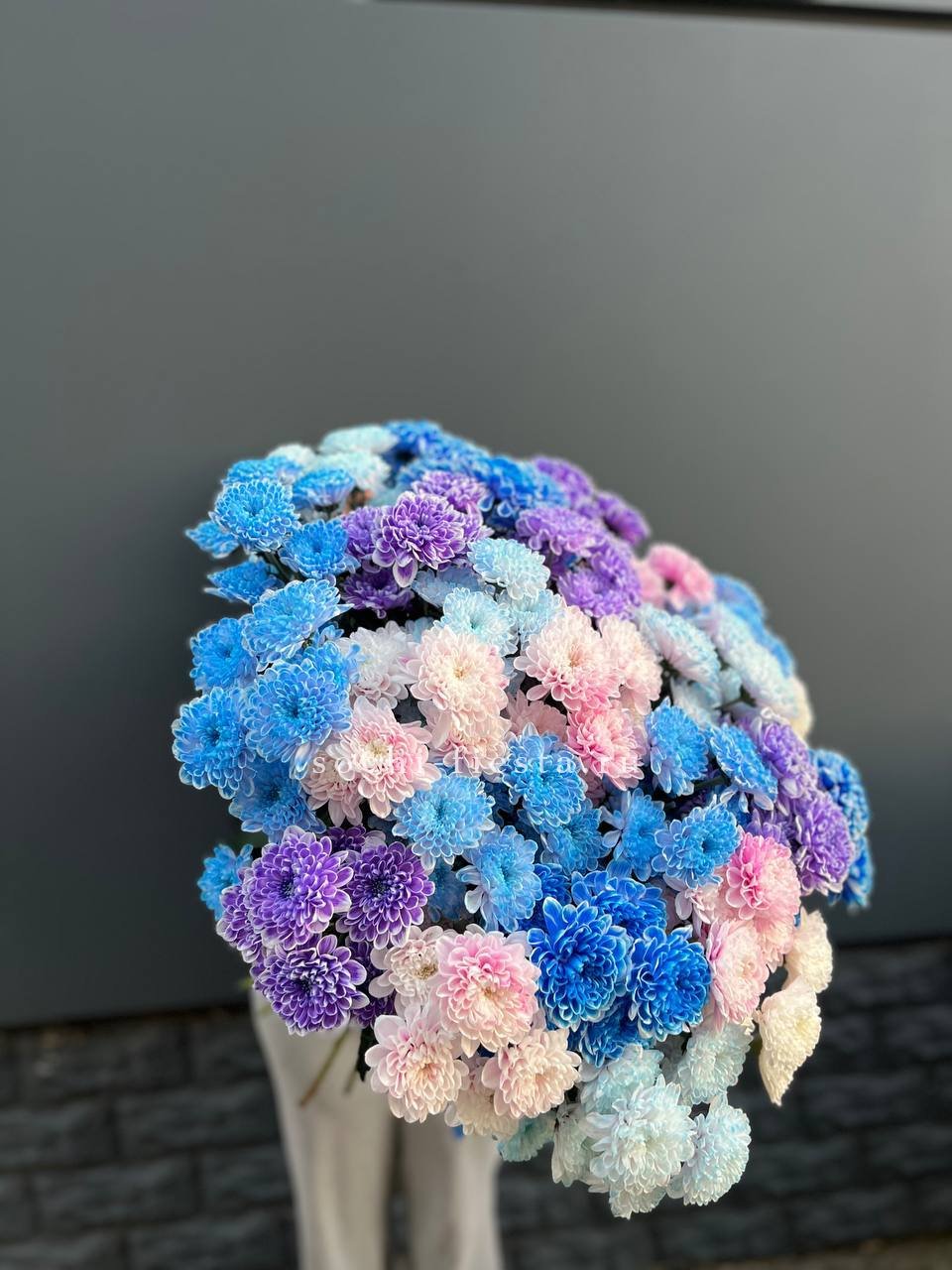 Двадцать пять веток кустовой хризантемы в миксе оттенков образуют живописное полотно. Каждый цвет звучит самостоятельно и при этом перетекает в соседний, создавая динамичную композицию.