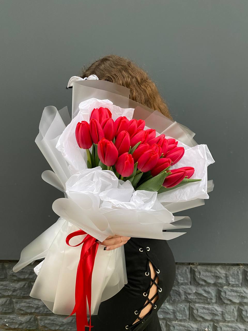 Сто один белоснежный тюльпан собран в плотную охапку с безупречной геометрией. Классическая упаковка сохраняет естественную красоту бутонов и подчёркивает масштаб композиции.