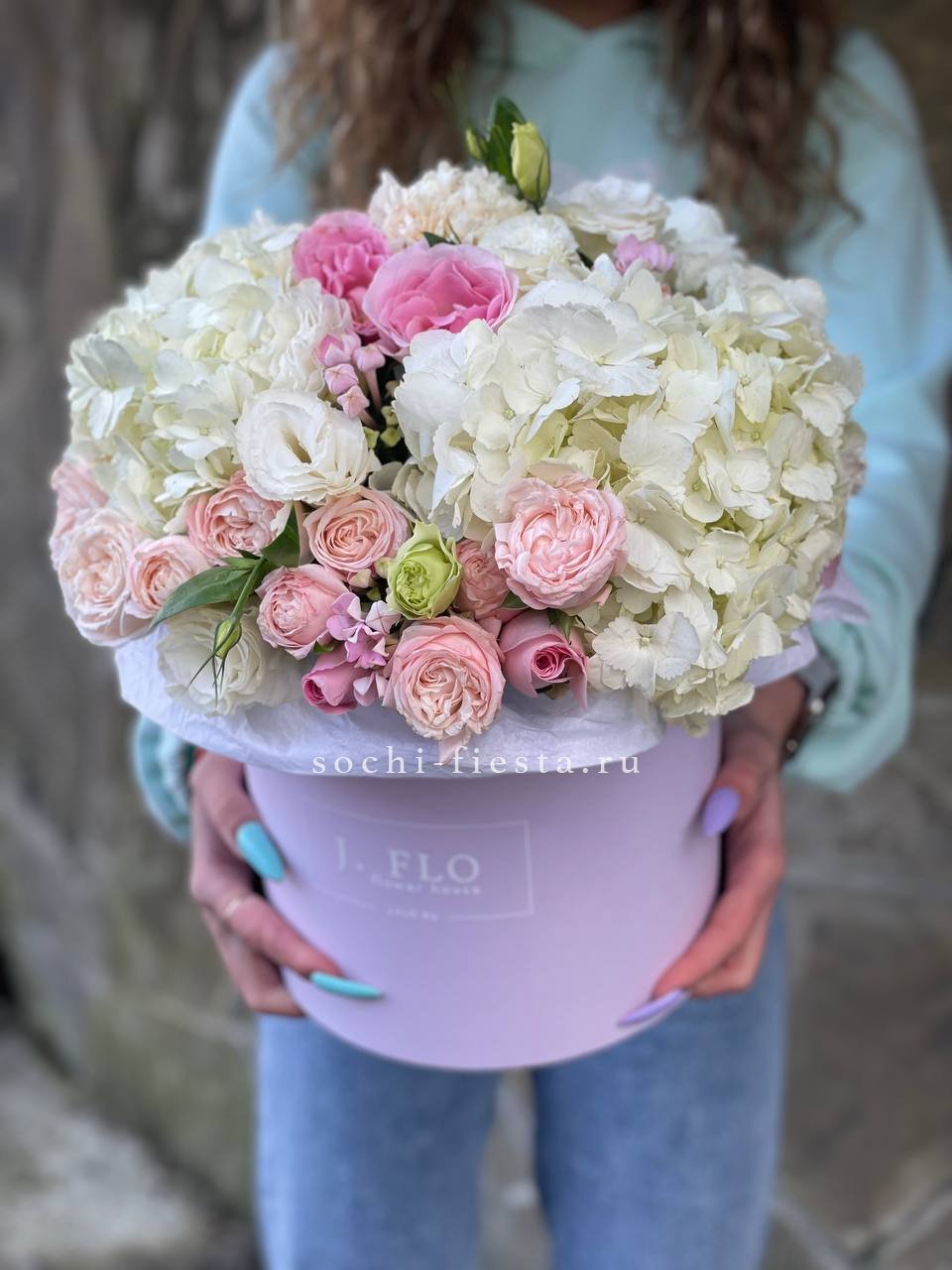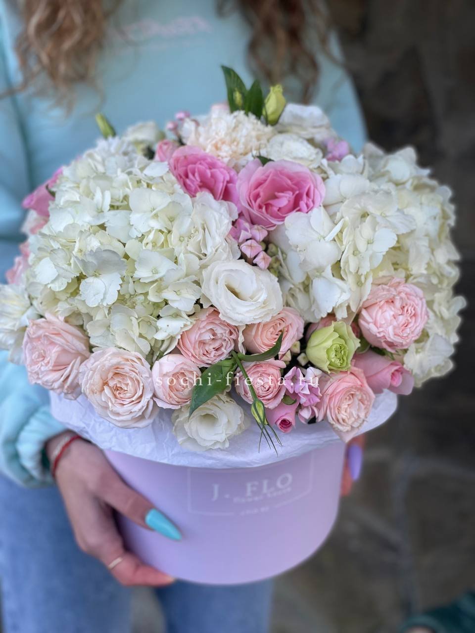гортензия, диантус, кустовая пионовидная роза, эустома, орхидеи (или аналог), эвкалипт, лента, дизайнерская упаковка.