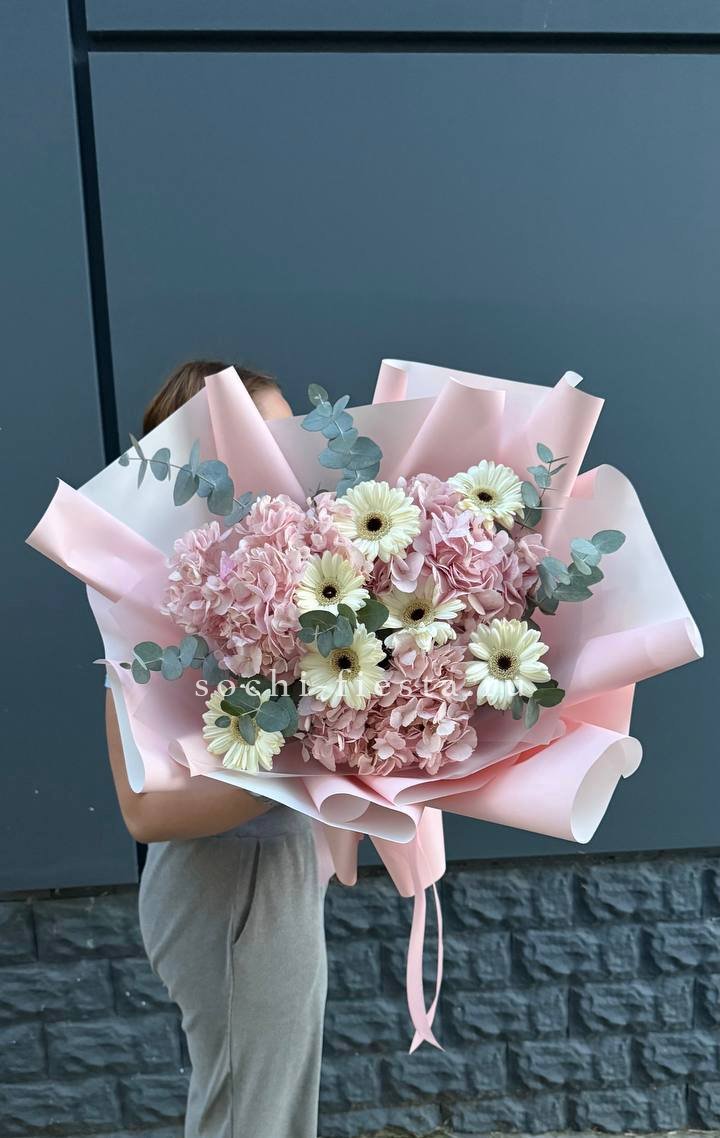гортензия, эустома, кустовая роза, маттиола (или львиный зев), роза одноголовая, каллы (или аналог), эвкалипт, лента, упаковкаСостав букета в несозон может нести незначительные изменения.