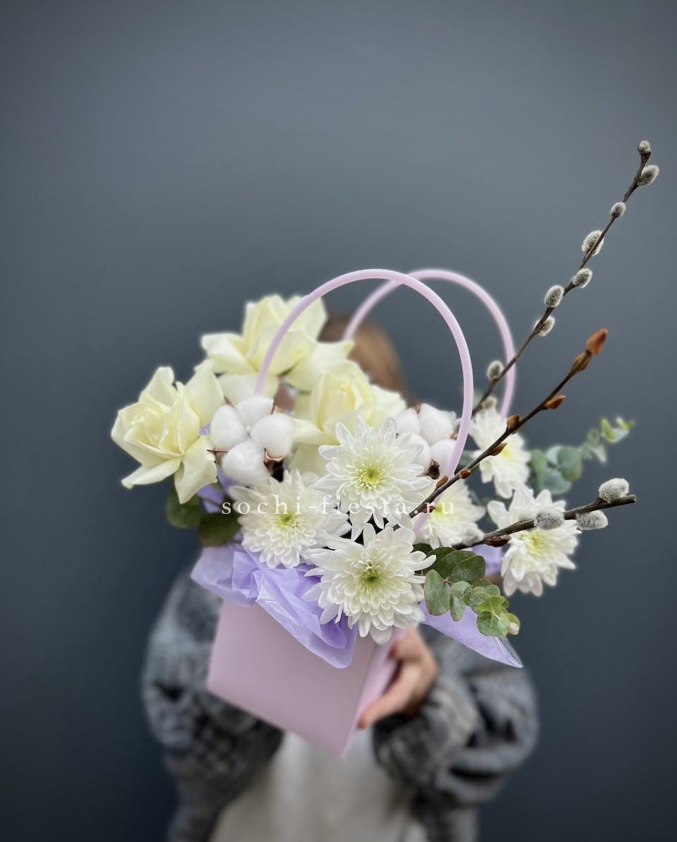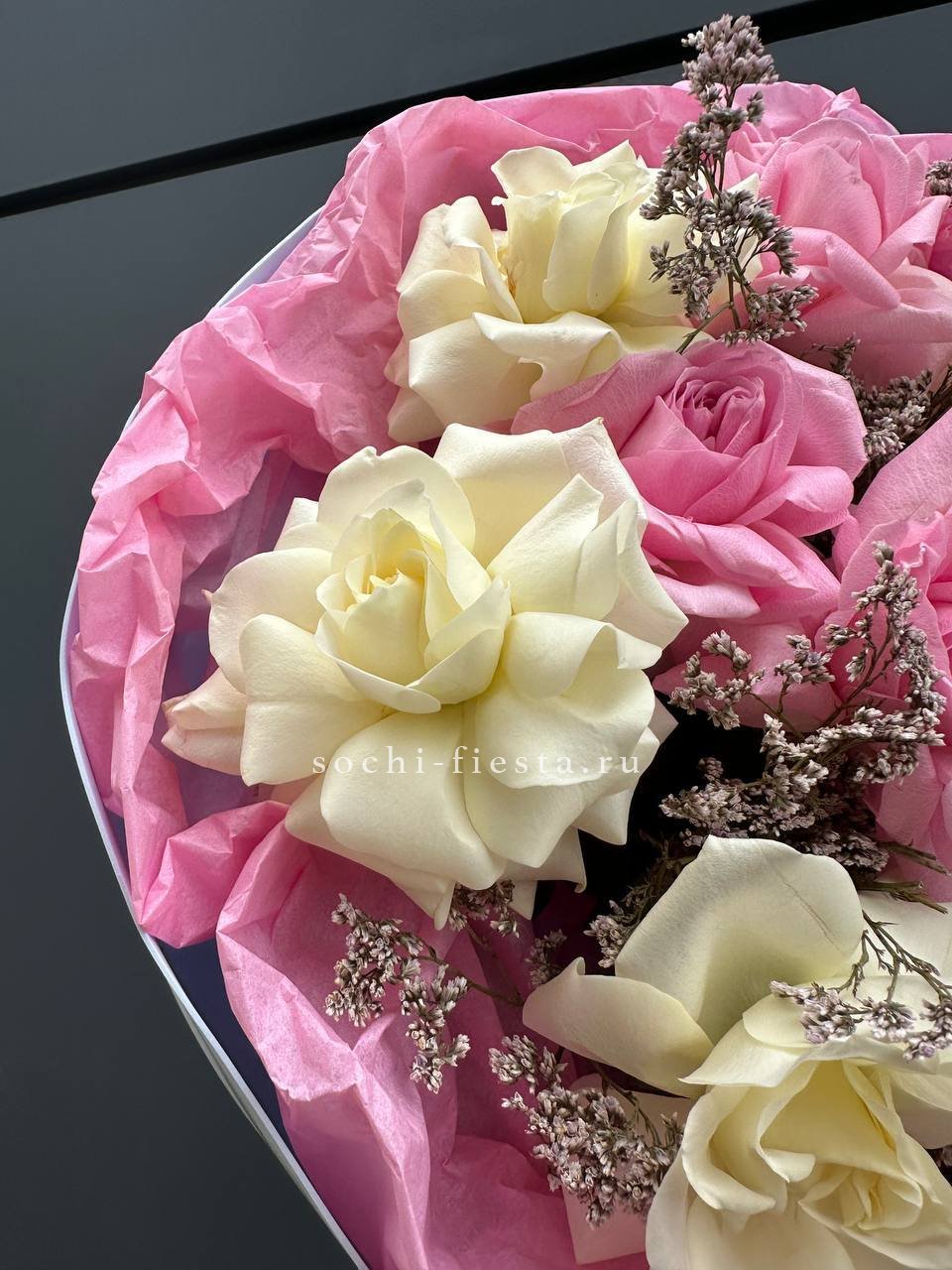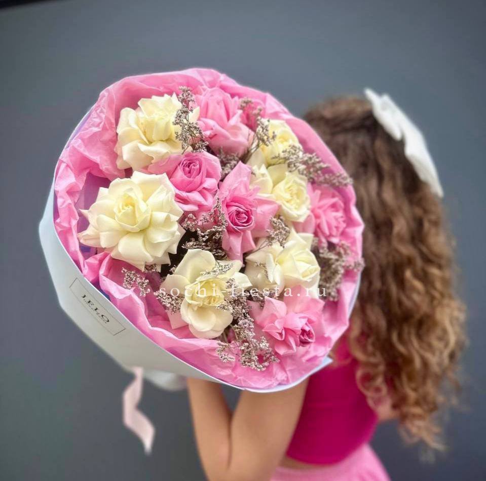 Микс из пионов, лилий и эустом в объёмном цилиндре создаёт впечатление пышного сада. Белые розы и маттиолы наполняют пространство светом, а статица добавляет графики.