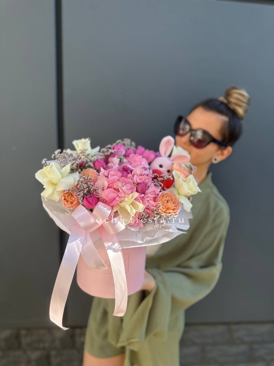 гортензия, бархатный цилиндр. По желанию заказчика, композицию можно оформить в корзину.