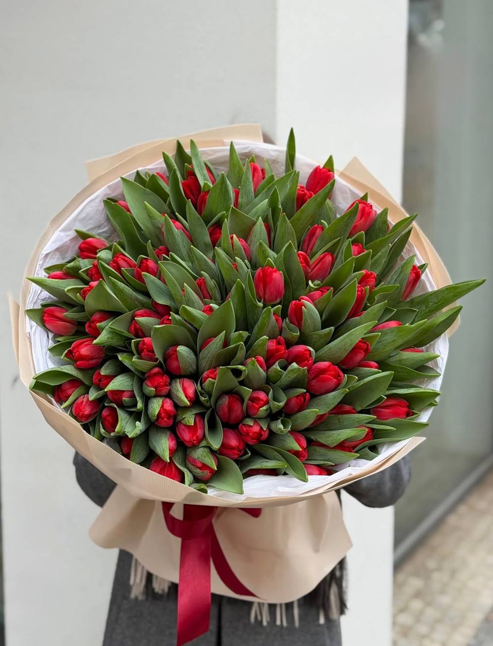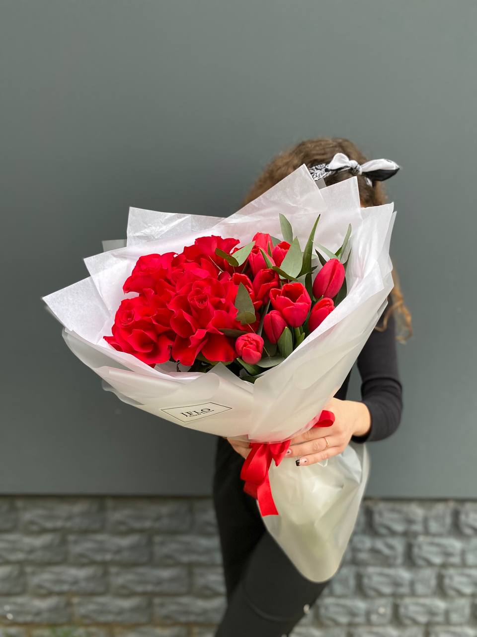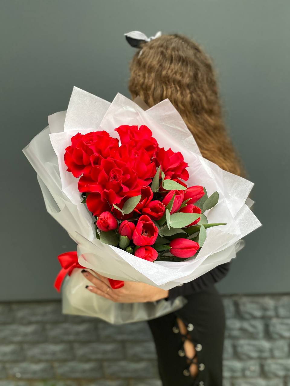 Красные тюльпаны переплетаются с розами в динамичной композиции, где весенняя лёгкость встречается с классической формой. Два цветка в одном букете создают визуальную глубину и живой ритм.