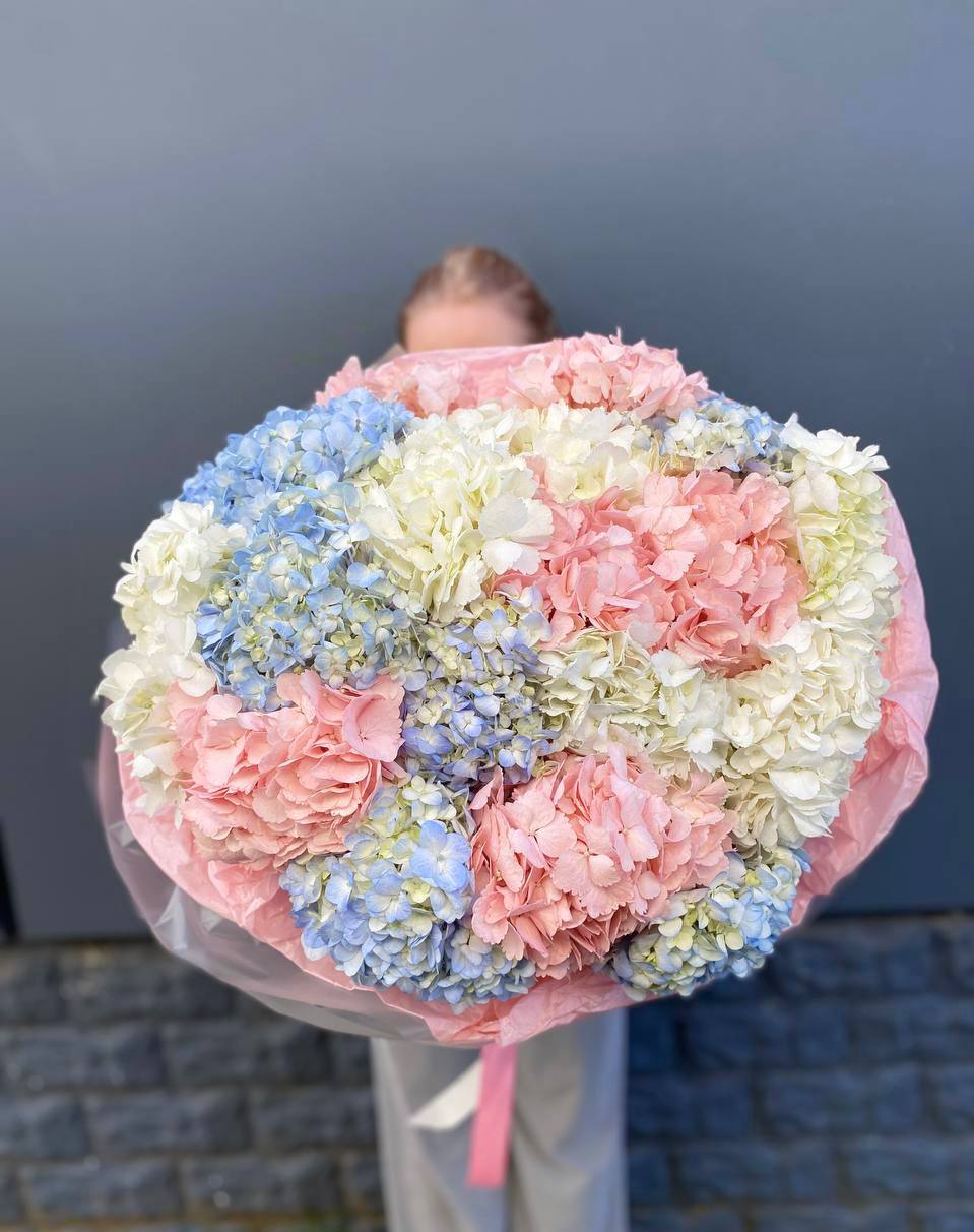 Масштабная композиция объединяет хризантемы, герберы, розы, антиринум и гортензию в плотную структуру с яркими акцентами. Диантус и бомбастик добавляют объем, а озотамус создает текстурные переходы между крупными соцветиями.