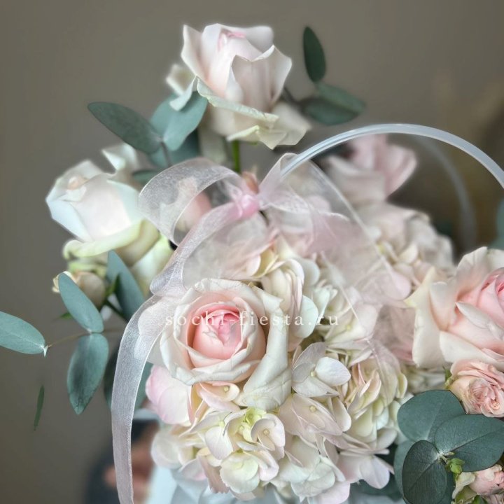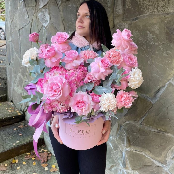 Наполнение подбирается под сезон и аудиторию. Зимой — амариллис, плотные розы, ранункулюсы. Весной — тюльпаны и ранункулюсы. Летом — пионы в мае-июне, гортензия в июле-августе. Осенью — хризантемы и декоративные травы.