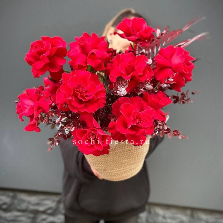 Размер выбирается по повод. Коллеге — M или L. Юбилей родителей — XL. Выписка из роддома — L в пудровых тонах. Корпоративный юбилей — XXL. Индустриальный профессиональный праздник — крупная корзина-коробка.