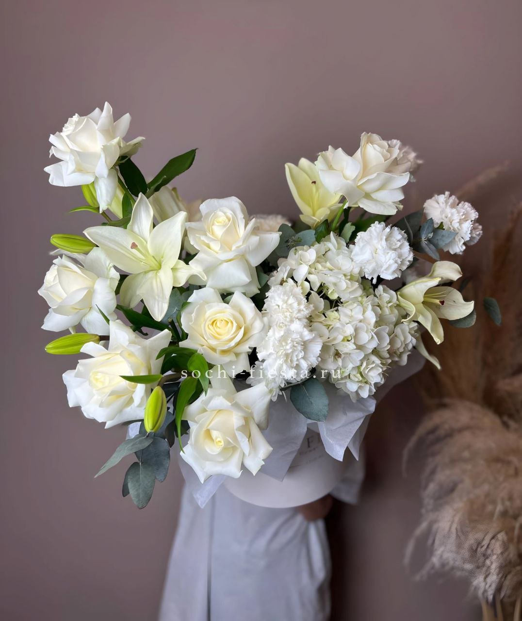 Белоснежные розы и воздушная эустома соседствуют с пышной гортензией и яркими вспышками статицы. Композиция собрана плотно, каждый цветок находит своё место в общем ритме.