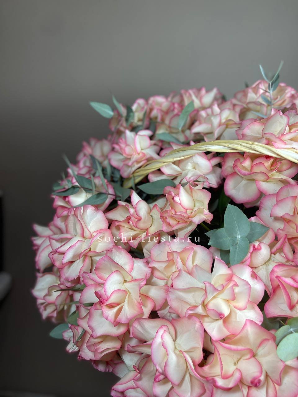 эустома, гортензия, белая роза, диантус, статица, бомбастик, бокс.