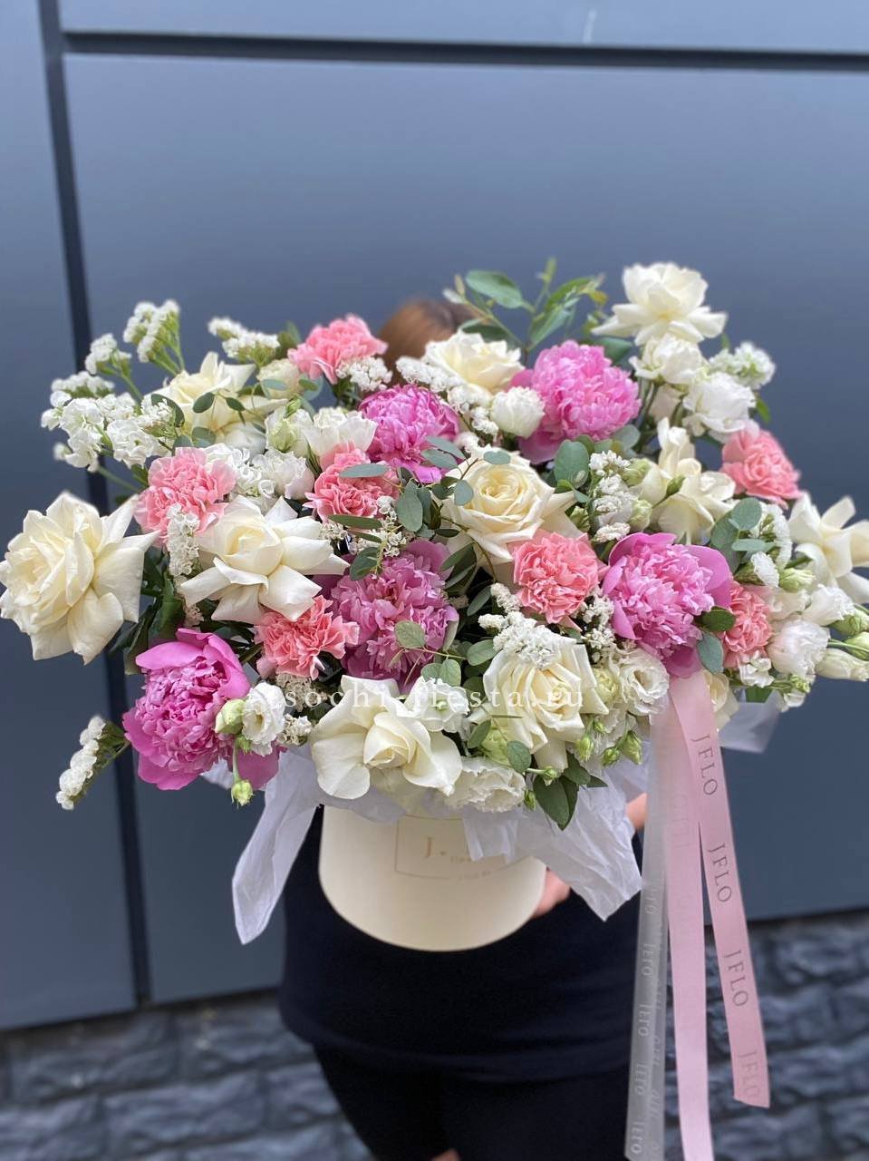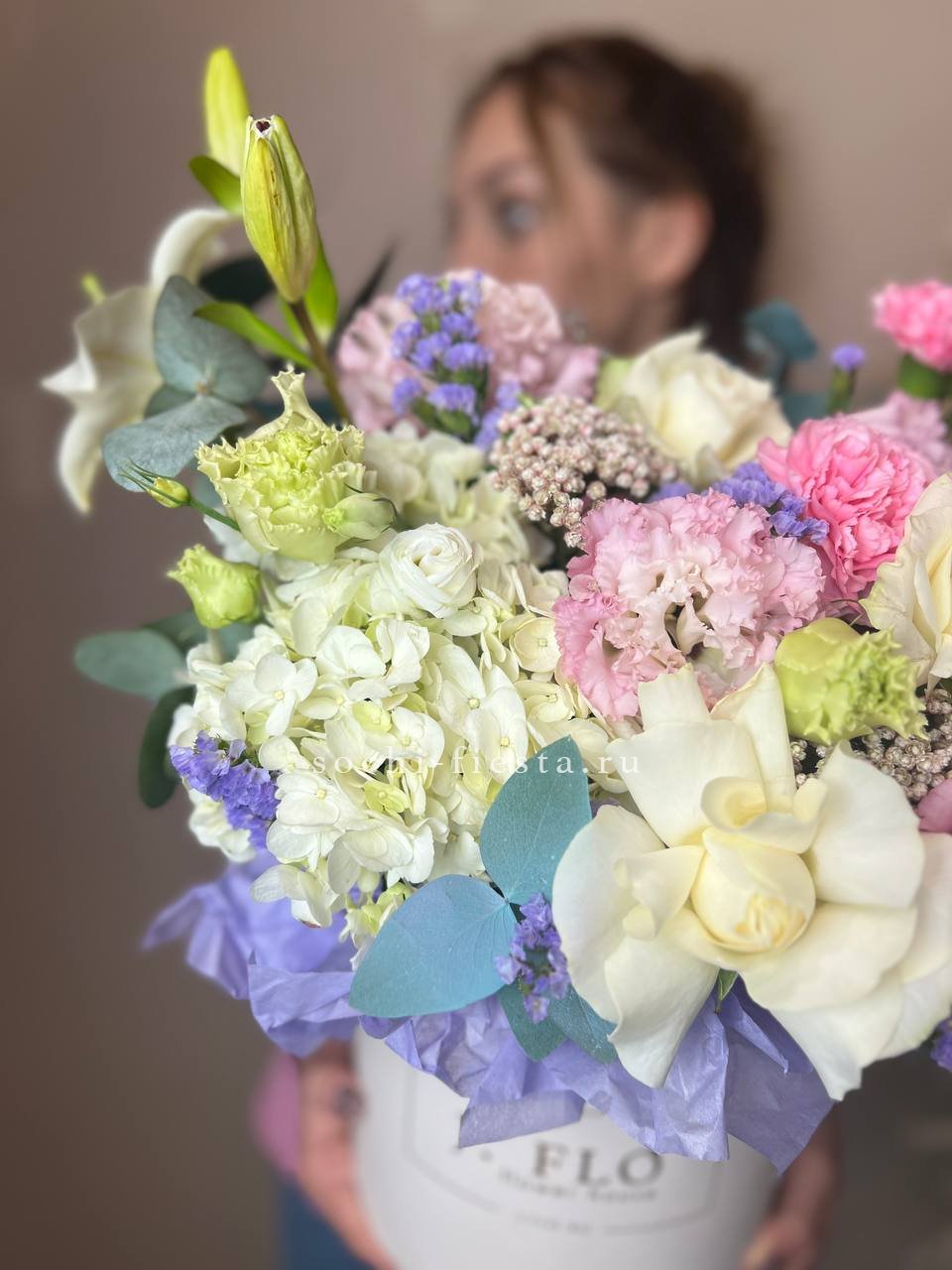 Пионовидные розы раскрываются пышными шапками среди воздушной гортензии и эустомы. Композиция собрана в круглом боксе и держит форму без дополнительной упаковки.