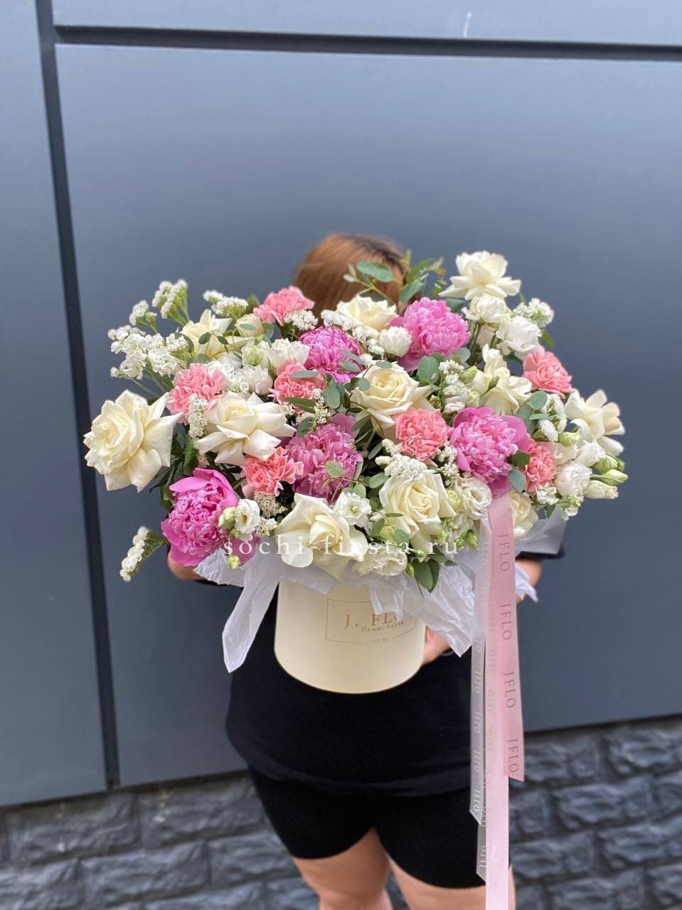 пионовидная роза, гортензия, эустома, декоративная зелень, бокс D20.