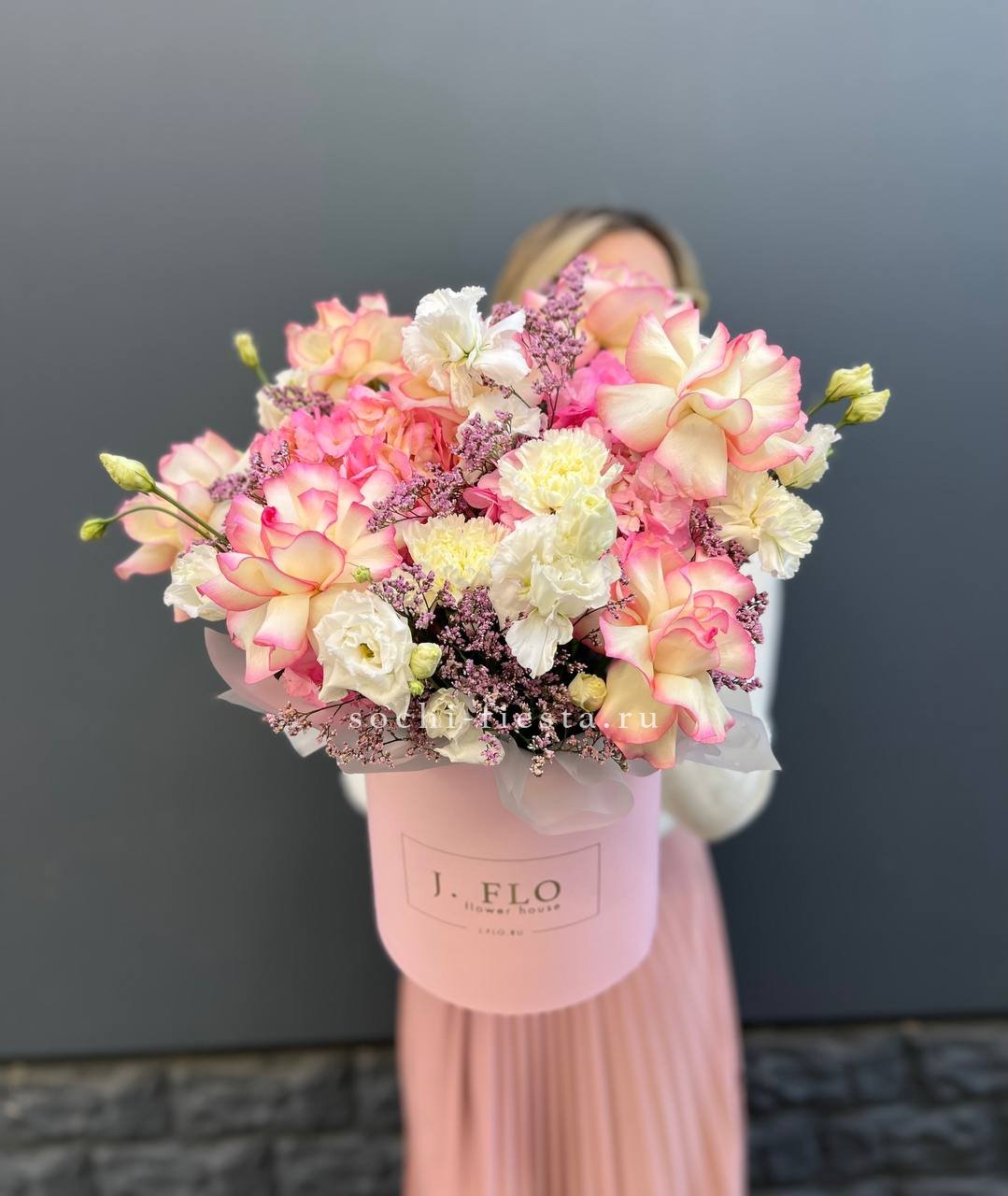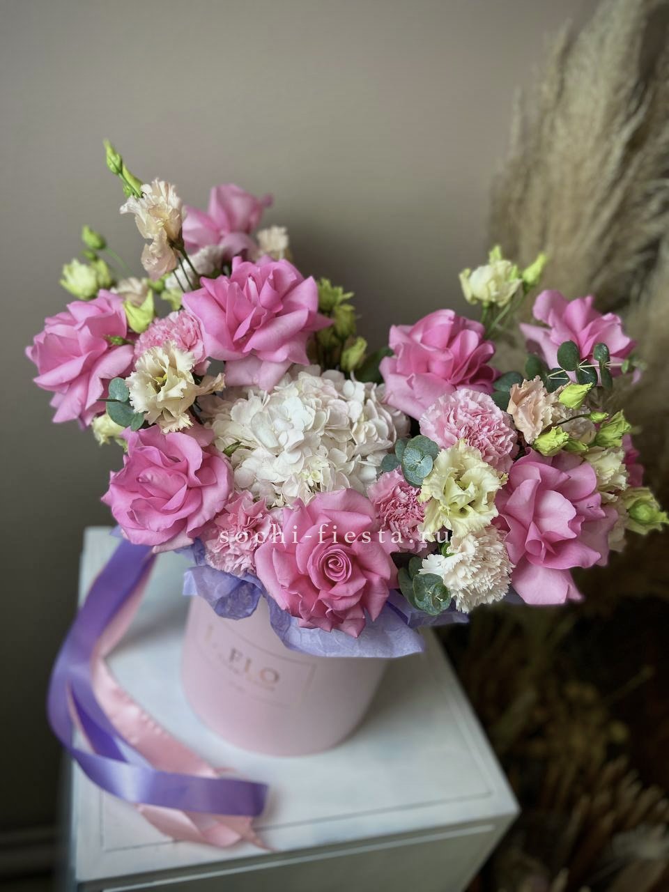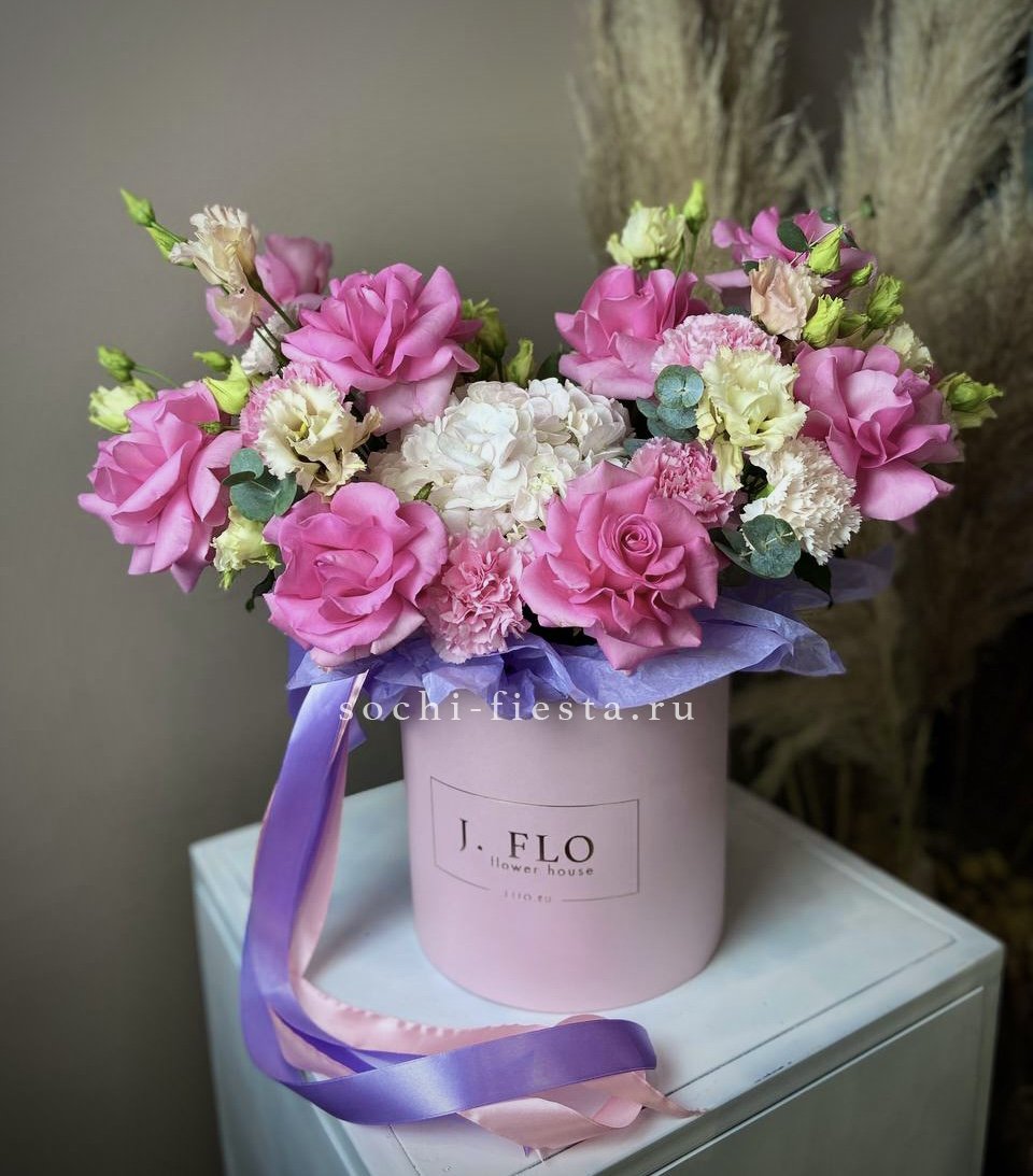 гортензия, вывернутые розы, диантус, кустовая роза, эустома, бокс D20, тишью.