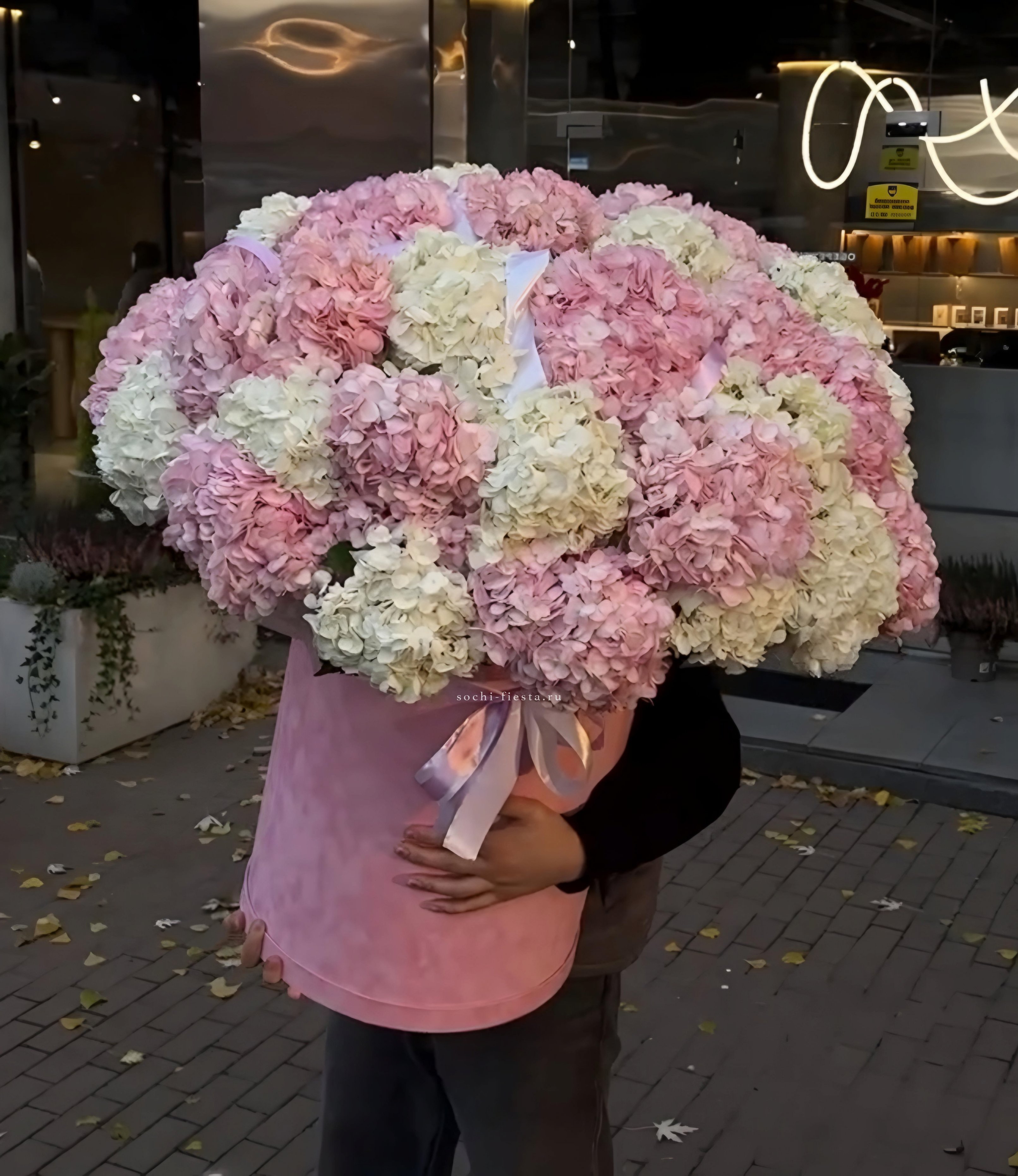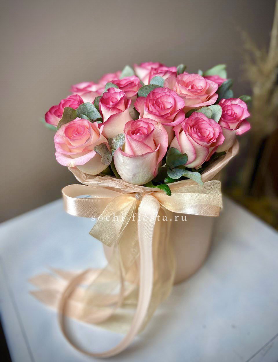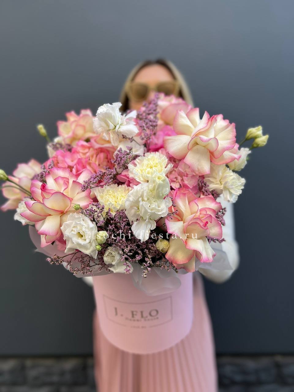 гортензия, вывернутые розы, диантус, кустовая роза, эустома, бокс D20, тишью.