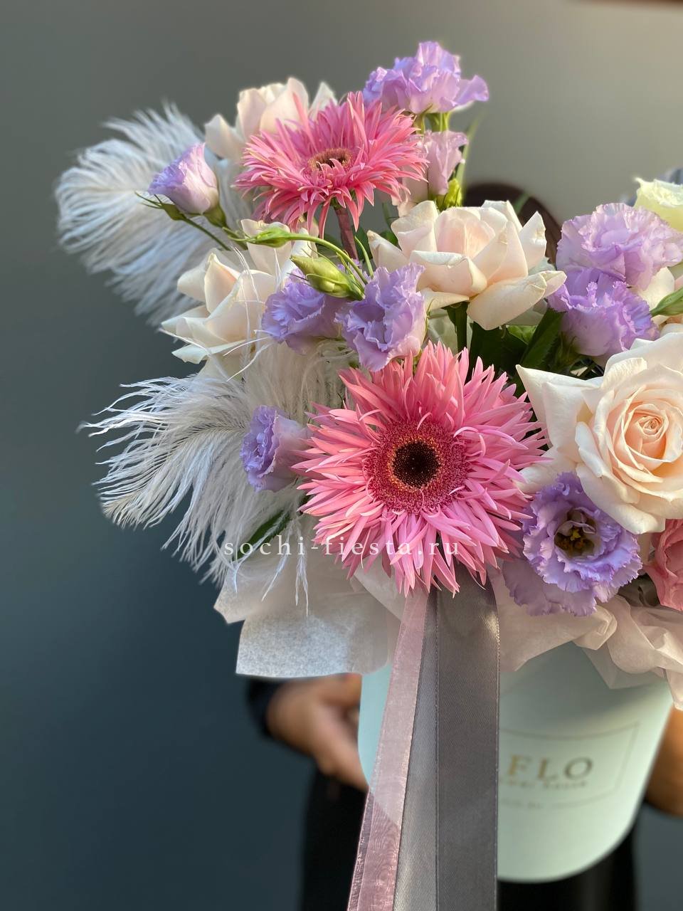 Французские розы переплетаются с герберами и эустомой в цилиндре большого диаметра. Объёмная композиция заполняет пространство и привлекает внимание сочной палитрой бутонов.
