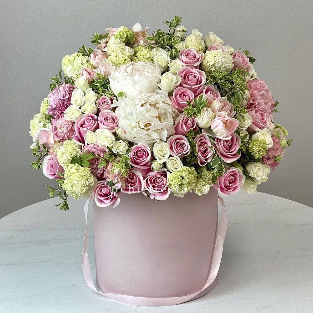 гортензия, диантус, бомбастик, мисти баблс, розы, антиринум, эустома, бокс гигант.