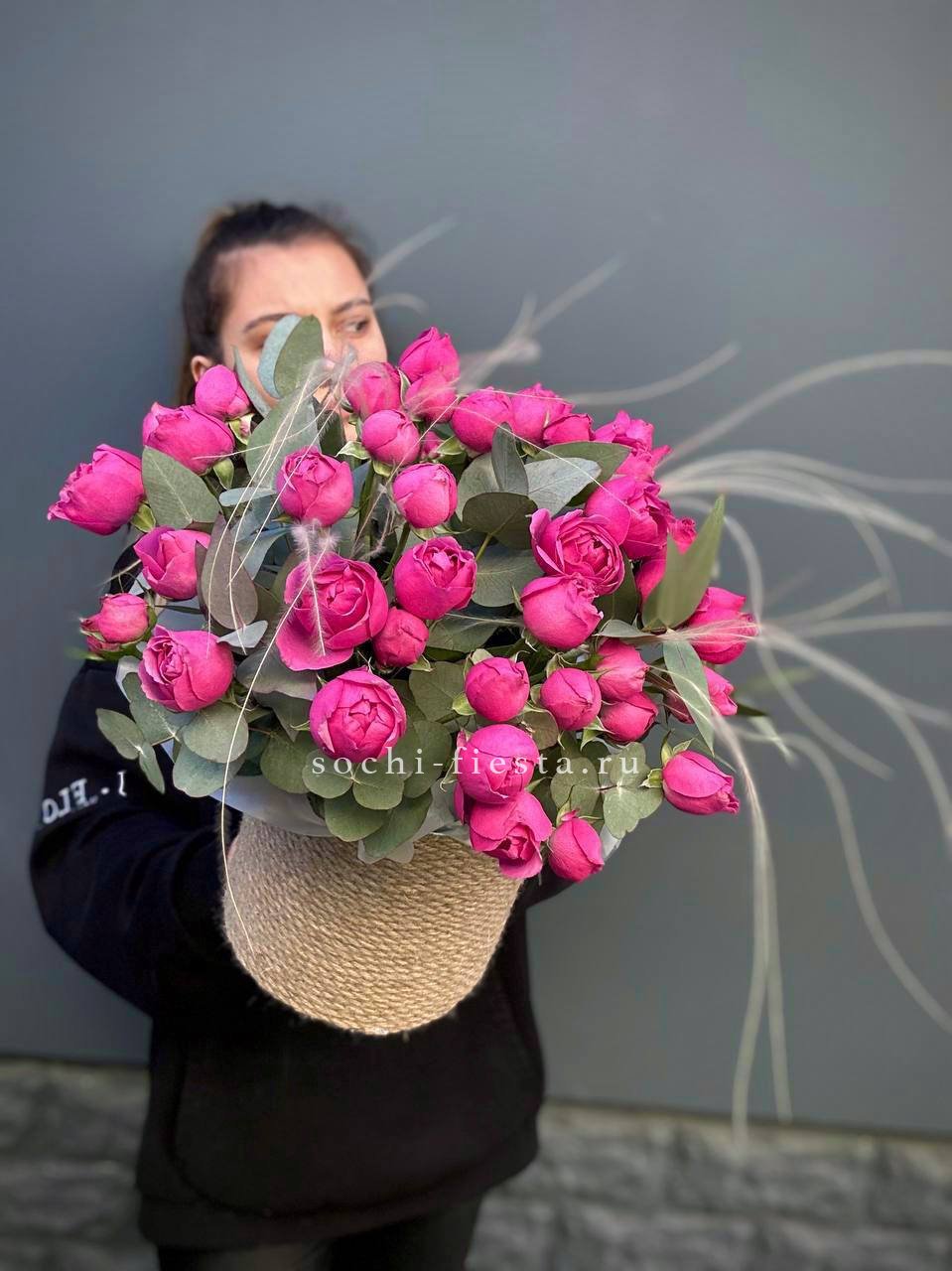 Для заказа товара "Пионовидные розы Мисти Бабблс в джутовом кашпо" с доставкой в Челябинске нажмите в корзину
