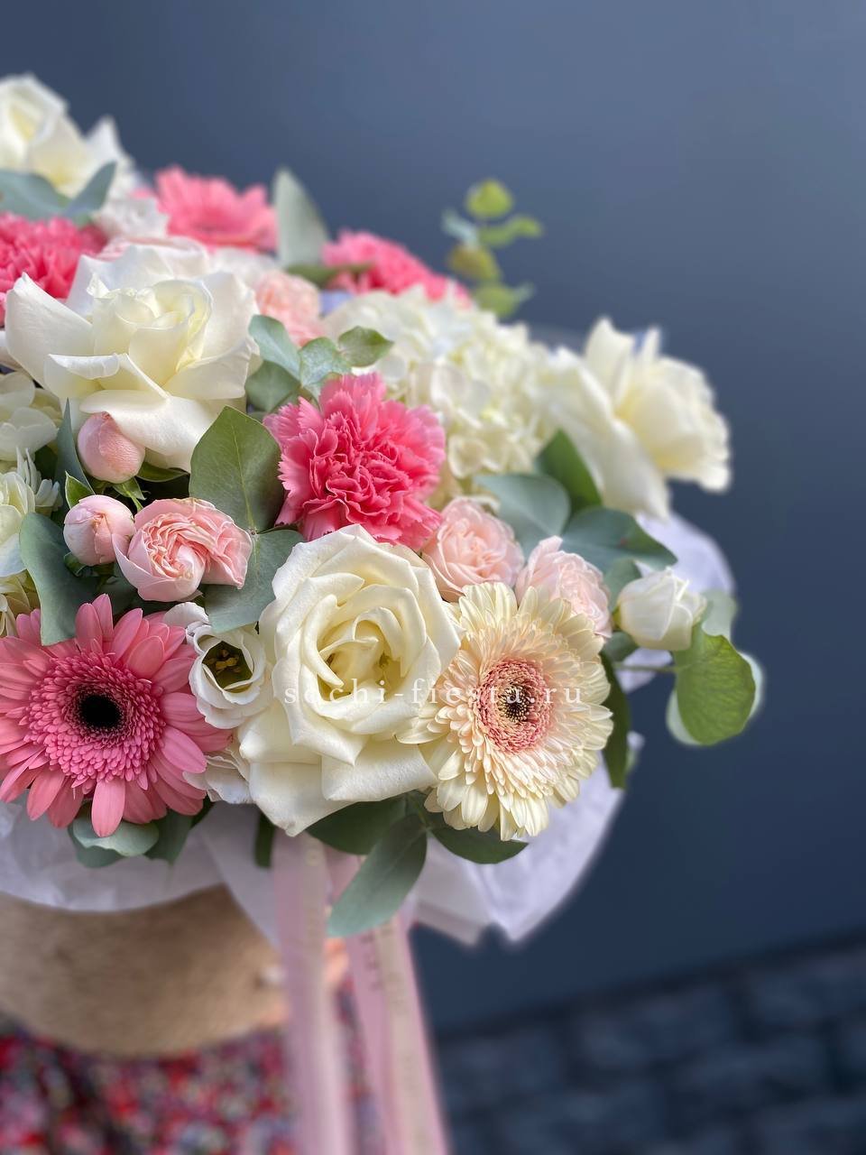 гербера, розы, диантус, бомбастик, гортензия, эустома, эвкалипт, джутовое кашпо.