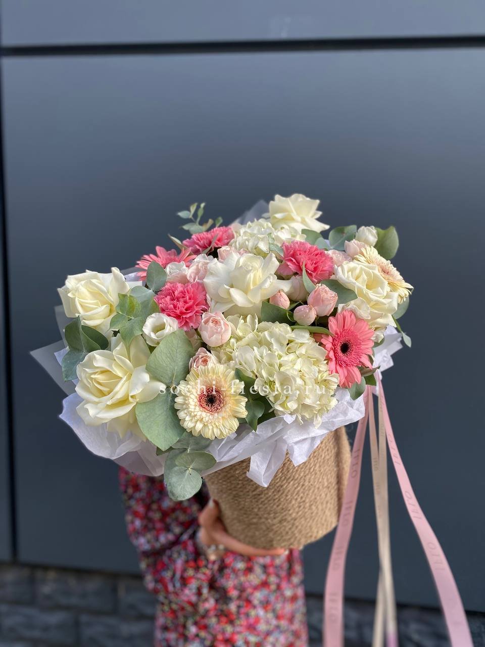 Этот букет создан, чтобы заряжать позитивом! Яркие акценты розовых гербер и теплые оттенки кремовых роз, в обрамлении свежей зелени, создают ощущение солнечного дня и беззаботного счастья. Это не просто цветы, а концентрат радости, который мгновенно поднимет настроение и добавит ярких красок в жизнь.