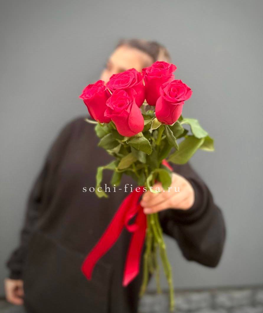 розовая роза - 7 шт., эвкалипт, лента, авторское оформление. Данная цена доступна при единовременном заказе от 10 шт.