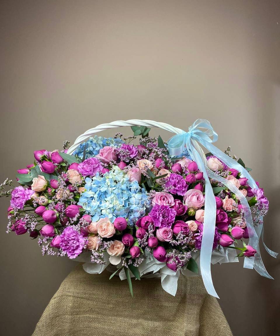 Корзина вмещает двести один бутон, образующих пышное цветочное полотно. Классическая форма подачи позволяет разместить композицию в любом пространстве без необходимости искать вазу. Впечатляющий объем для важных событий.