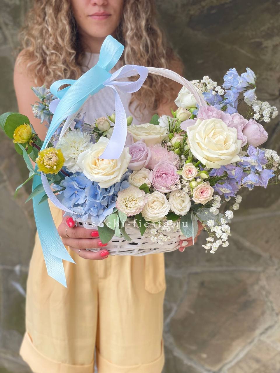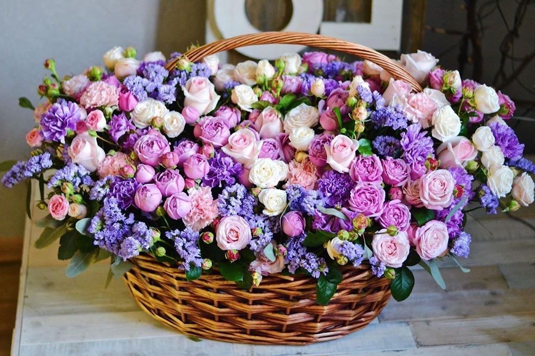 корзина выполнена в нежно-сиреневых тонах с применением декоративной зелени Состав: диантусы, эустома, эвкалипт, декоративная зелень,розы лента, светлая корзина.