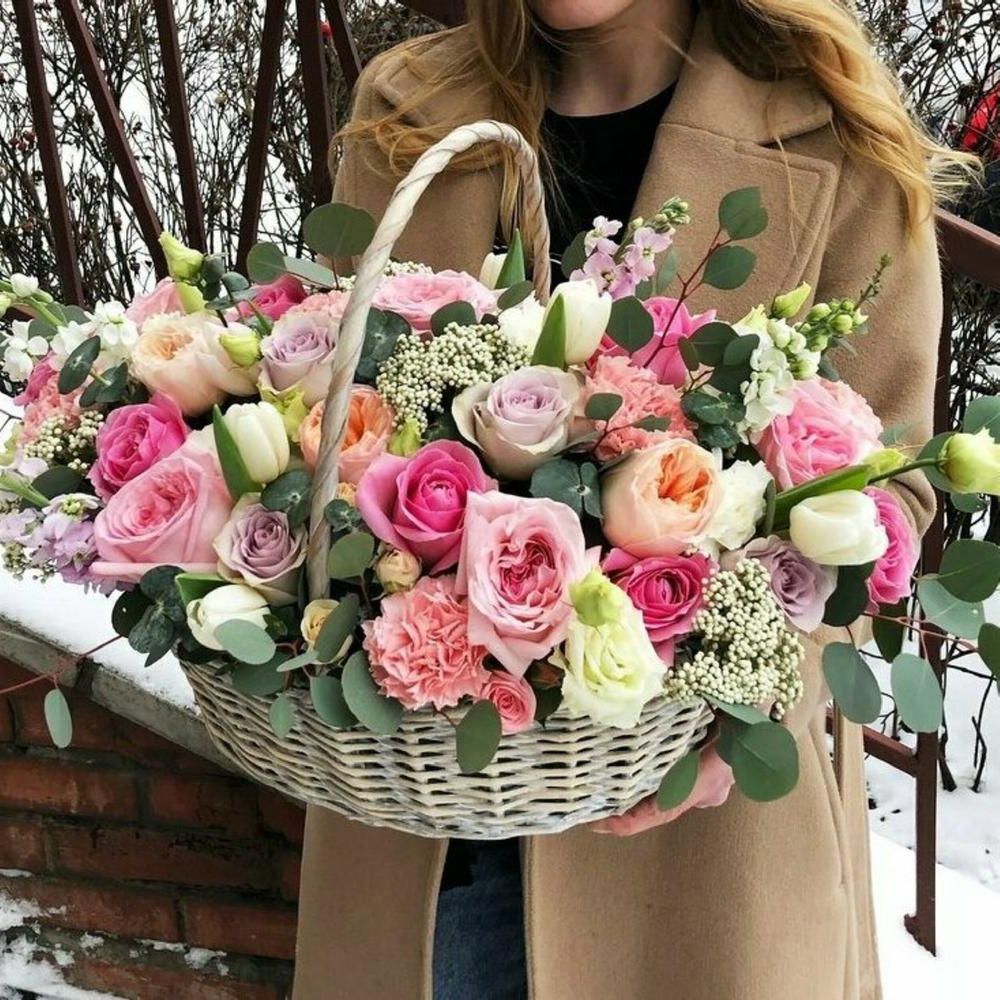 Пышная корзина с крупными бутонами роз, лилий и гортензий создаёт объёмную композицию с плавными переходами между соцветиями. Пионы добавляют воздушности и мягкости всей форме.