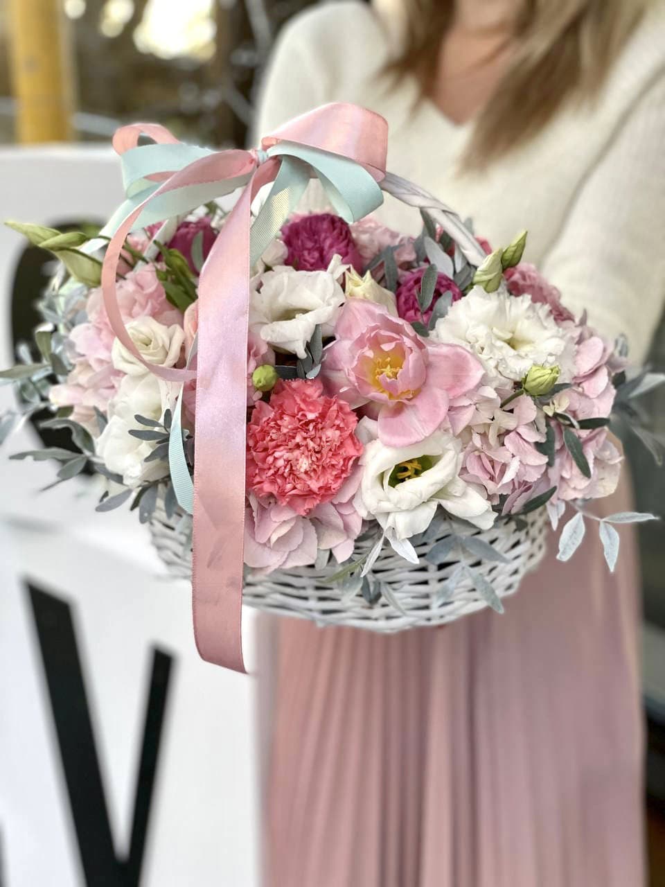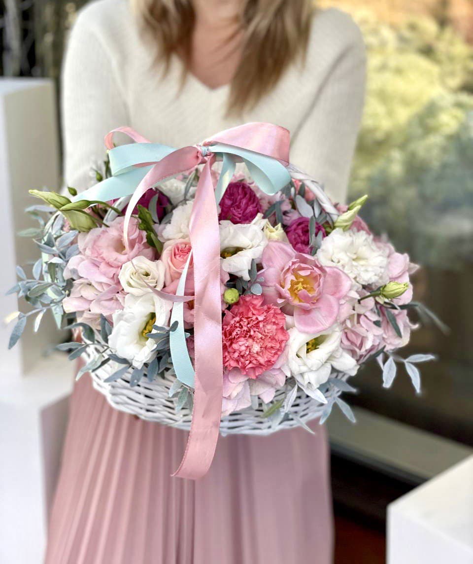 гортензия, розы одноголовые, лилии, пионы или замена на сезонные цветы, вспомогательная зелень, лента, корзина D40.