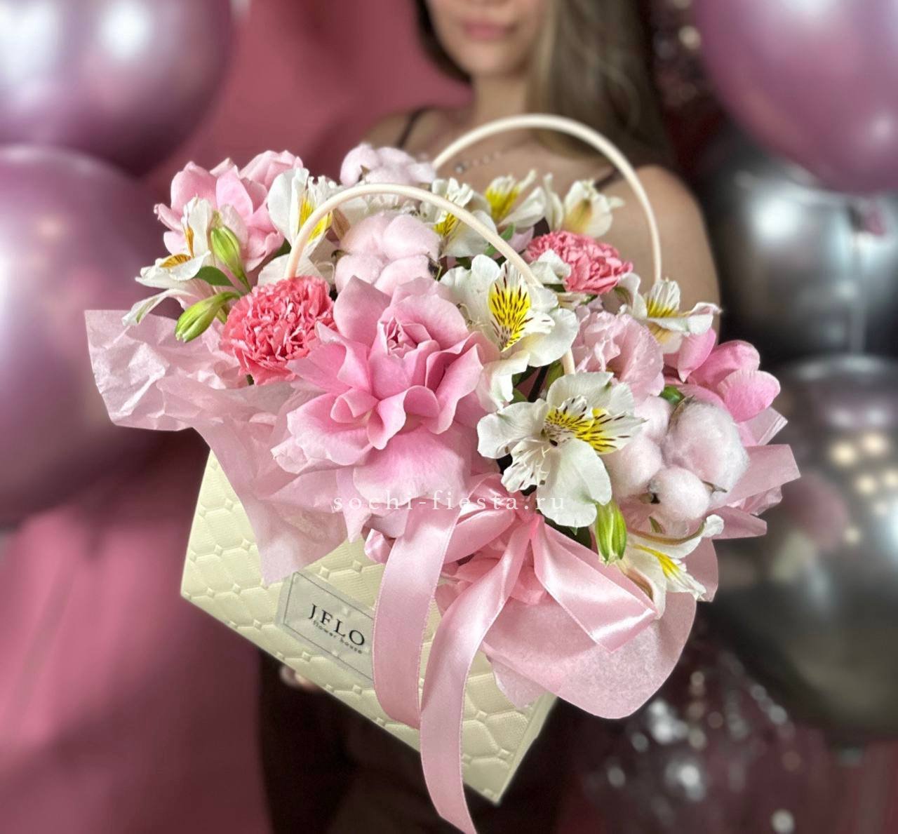 Пышные пионовидные розы Мисти Баблс и бомбастик создают объёмное облако в естественной плетёной корзине. Диантусы и статица добавляют воздушности, а эвкалипт завершает композицию свежими нотами. Яркое присутствие в любом пространстве.