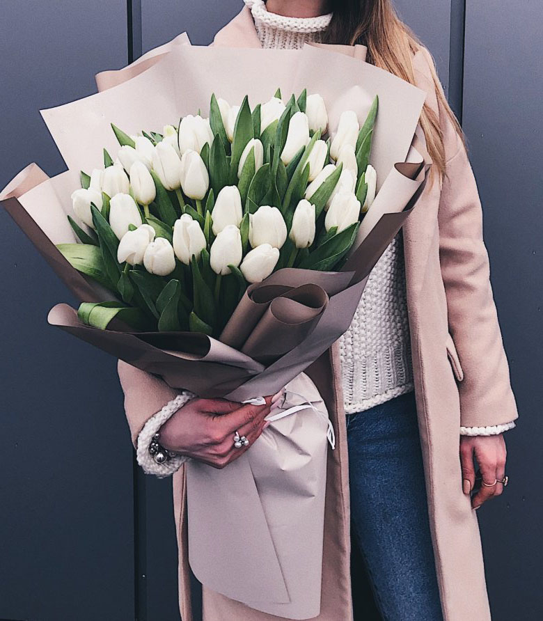 29 белых тюльпанов, лента, дизайнерская пленка, оформление.