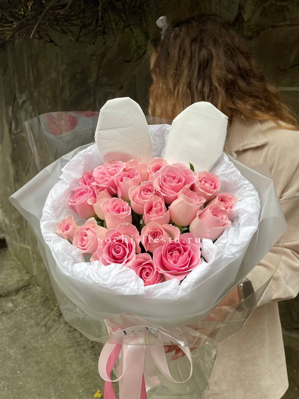 17 роз белого, розового и красного оттенков, лента, пленка.