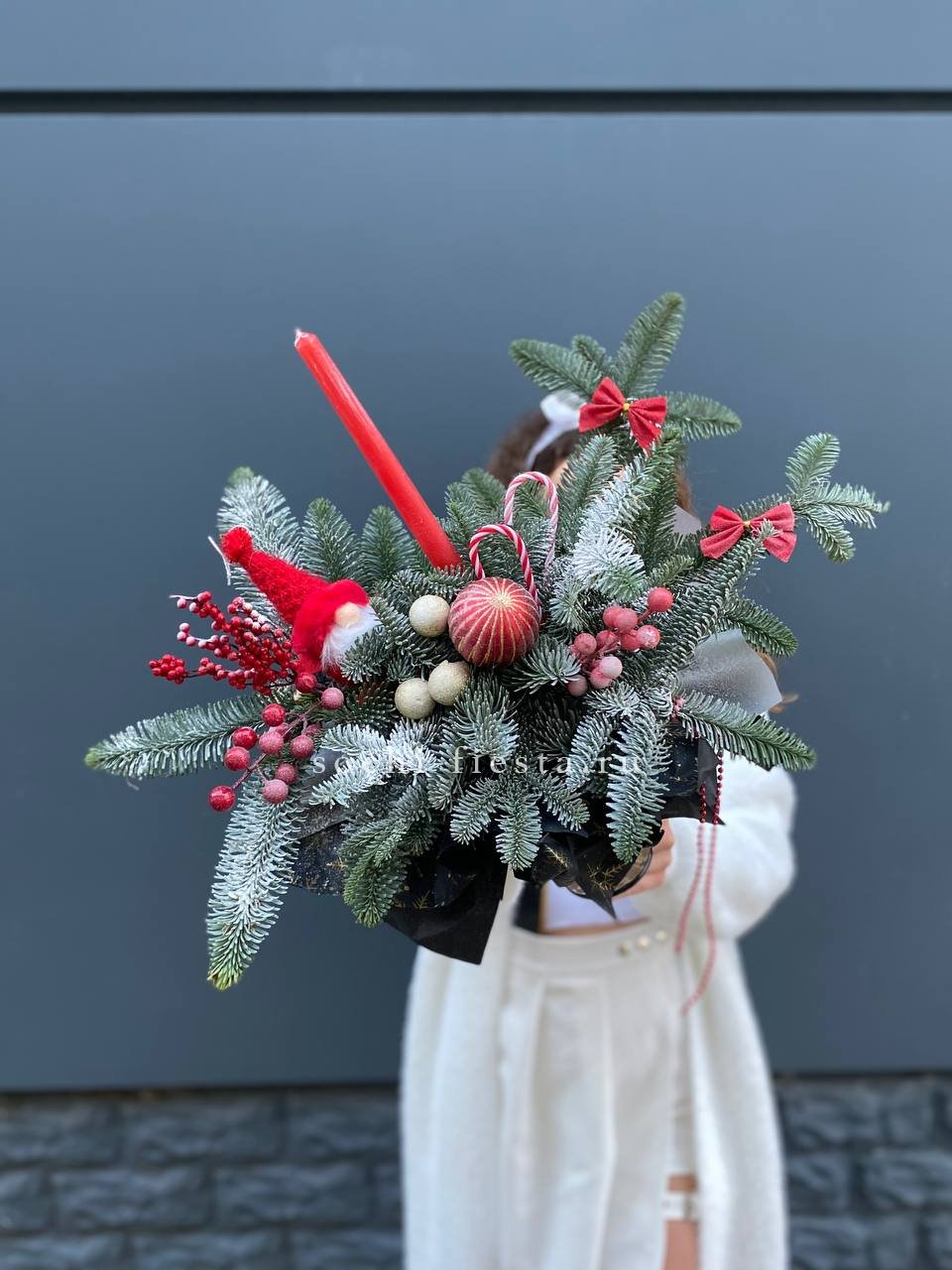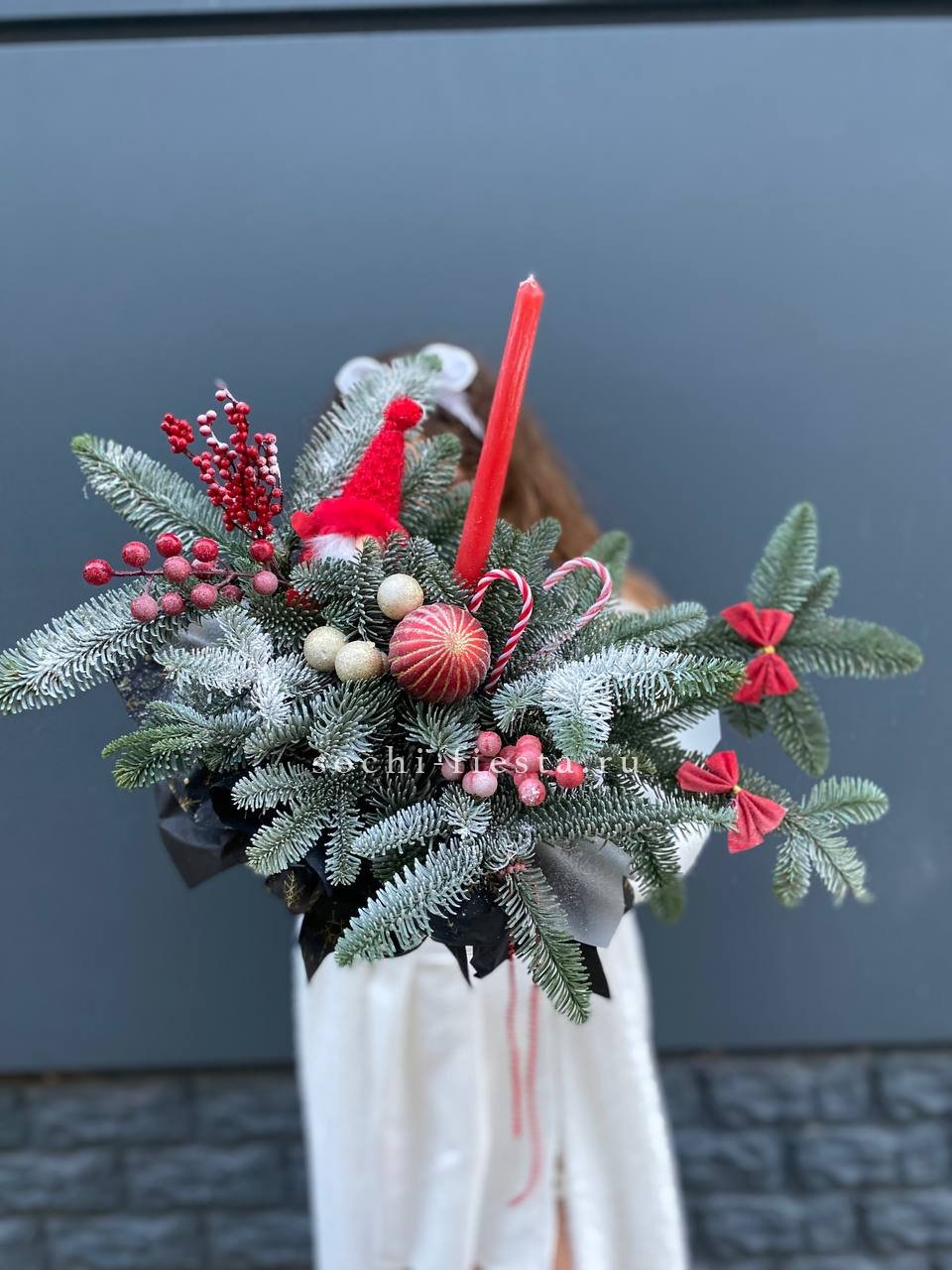 Бокал становится основой для композиции, где нобилис и праздничные игрушки образуют плотную структуру. Свечи завершают форму, а красный тон задаёт яркое звучание всему решению.