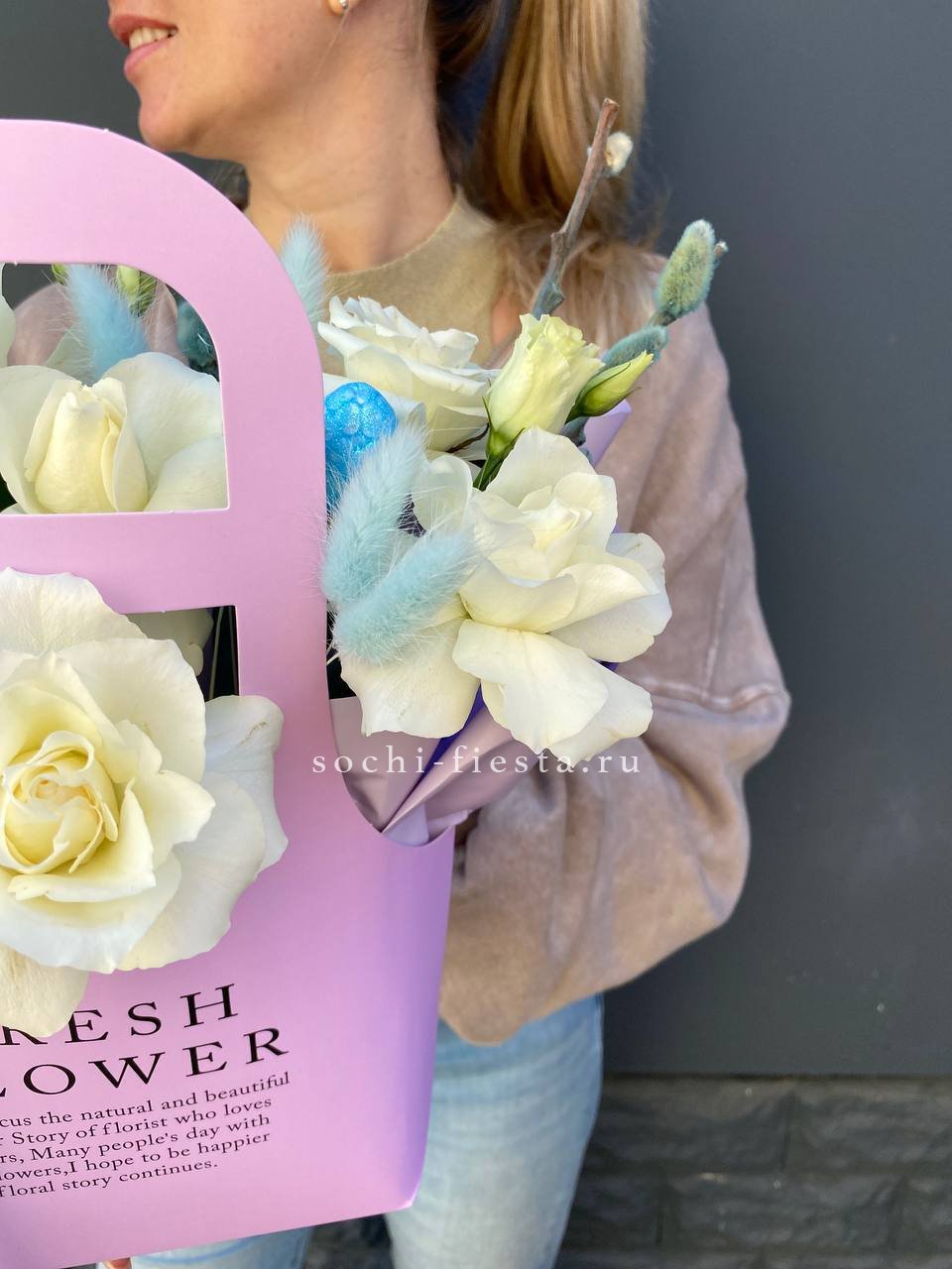 белые розы, верба, лагурус, эвкалипт, яица, сумочка.