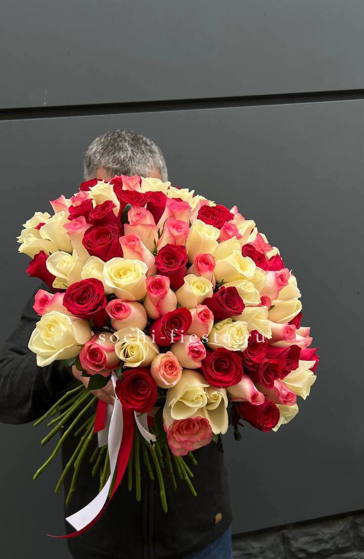 101 роза разноцветных оттенков, лента, упаковка на выбор.