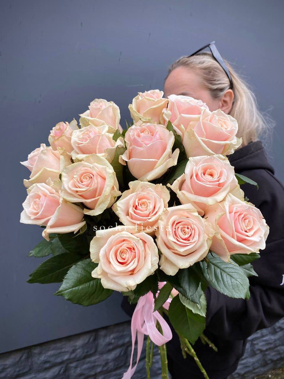 15 высоких кремовых роз, лента, упаковка на выбор.