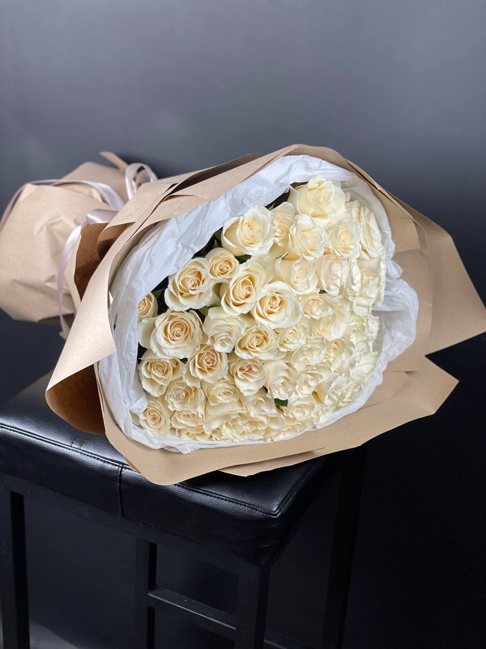 Белые головки собраны в плотный купол без единого просвета. Пятьдесят один бутон создает монолитную форму, где каждый цветок поддерживает соседний. Лаконичная упаковка сохраняет чистоту линий и фокус на безупречной геометрии композиции.