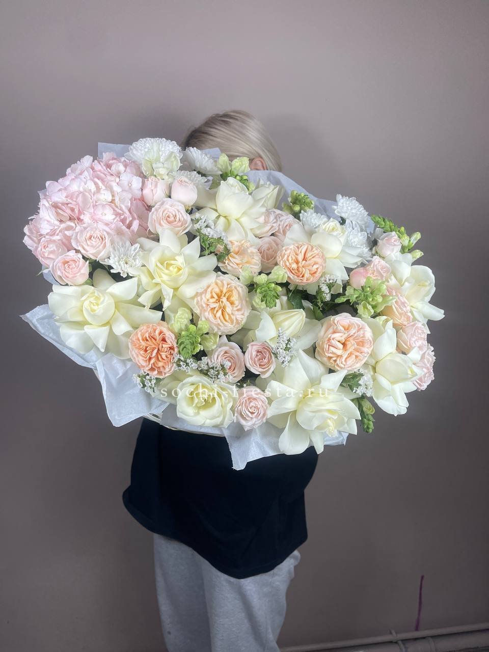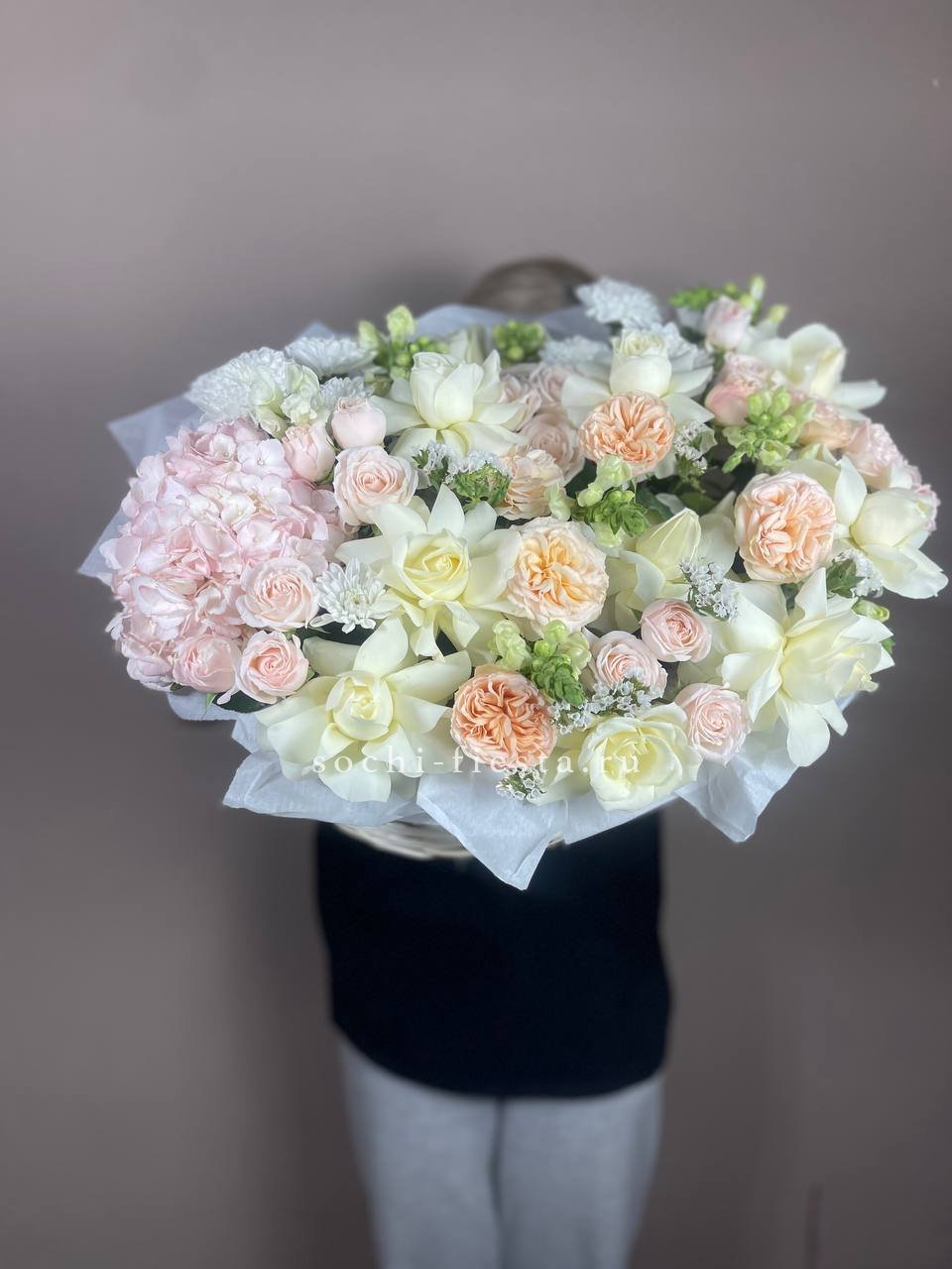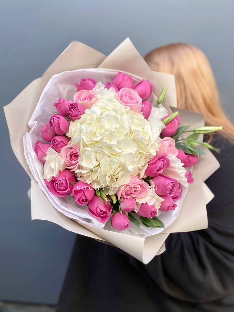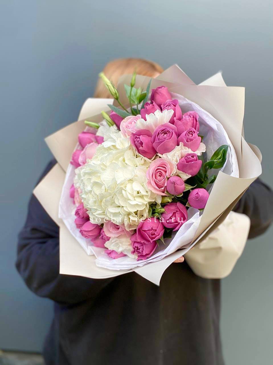 гортензия, герберы, эустомы, розы, диантус, эвкалипт, лента, дизайнерская упаковка.